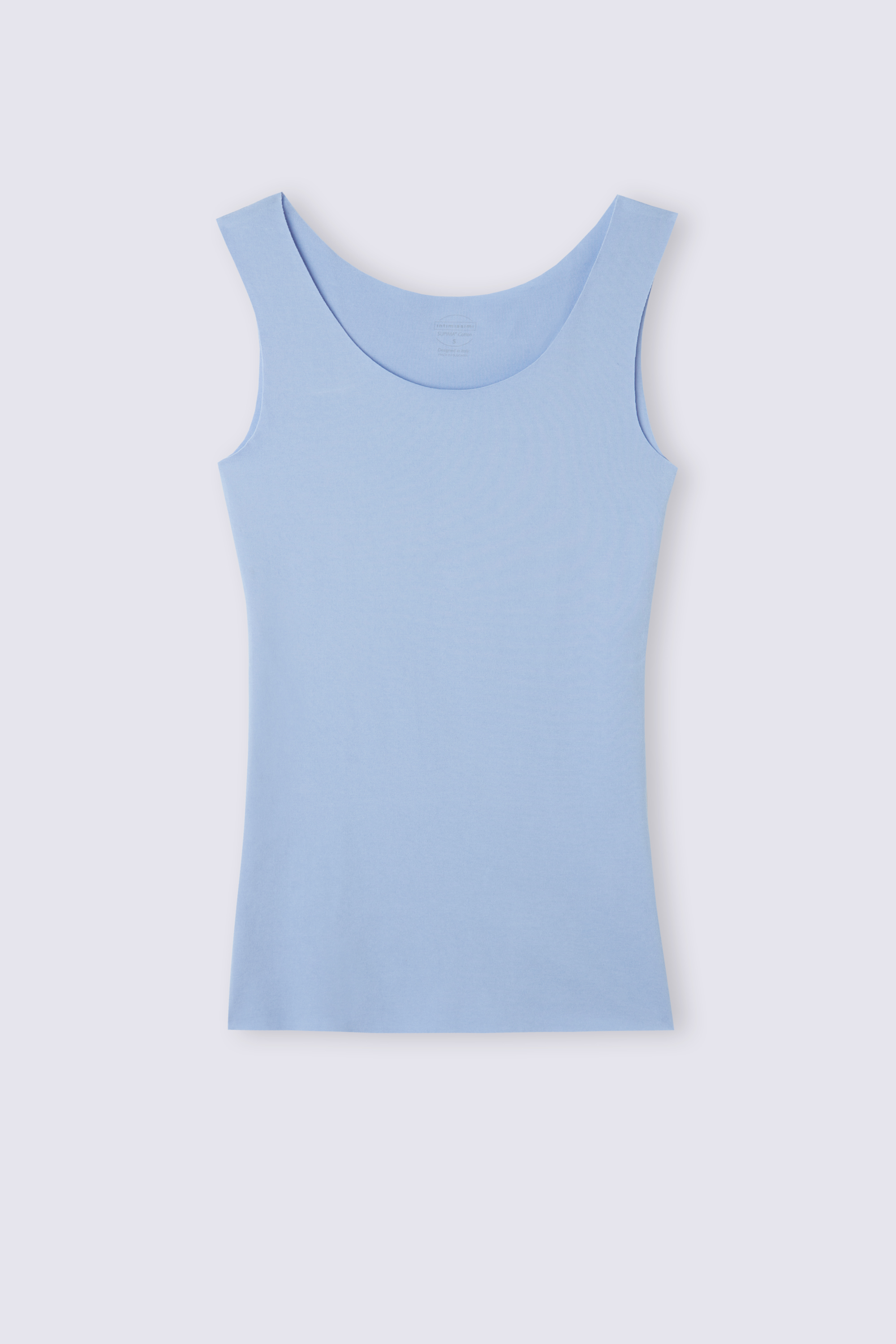 Майка с широкими бретелями и низким круглым вырезом. Модель из эластичного хлопка с открытыми срезами. Рост модели: 179 см. Размер изделия на фотографии: S.