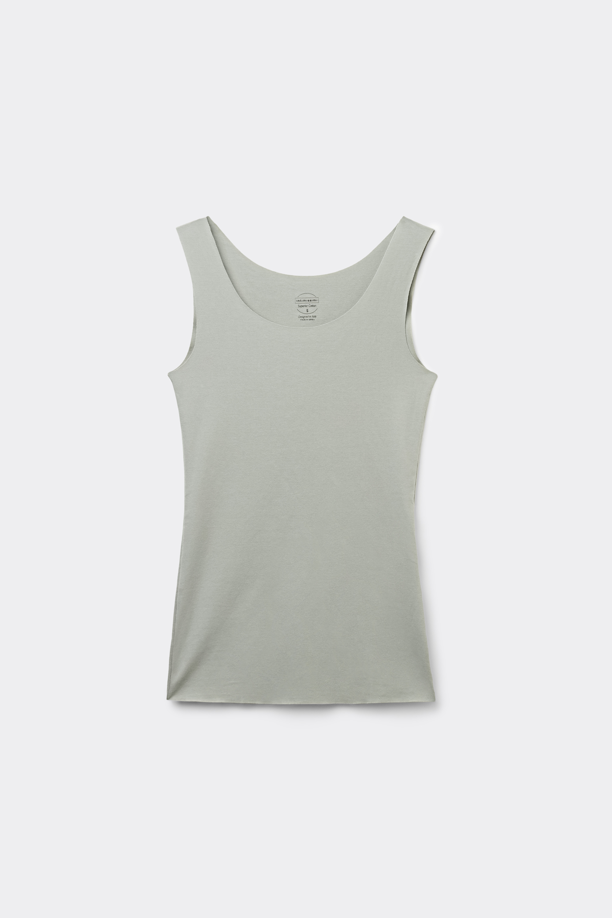Майка с широкими бретелями и низким круглым вырезом. Модель из эластичного хлопка с открытыми срезами. Рост модели: 179 см. Размер изделия на фотографии: S.