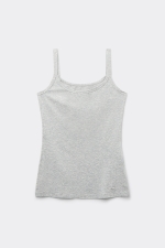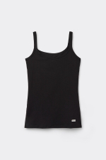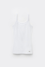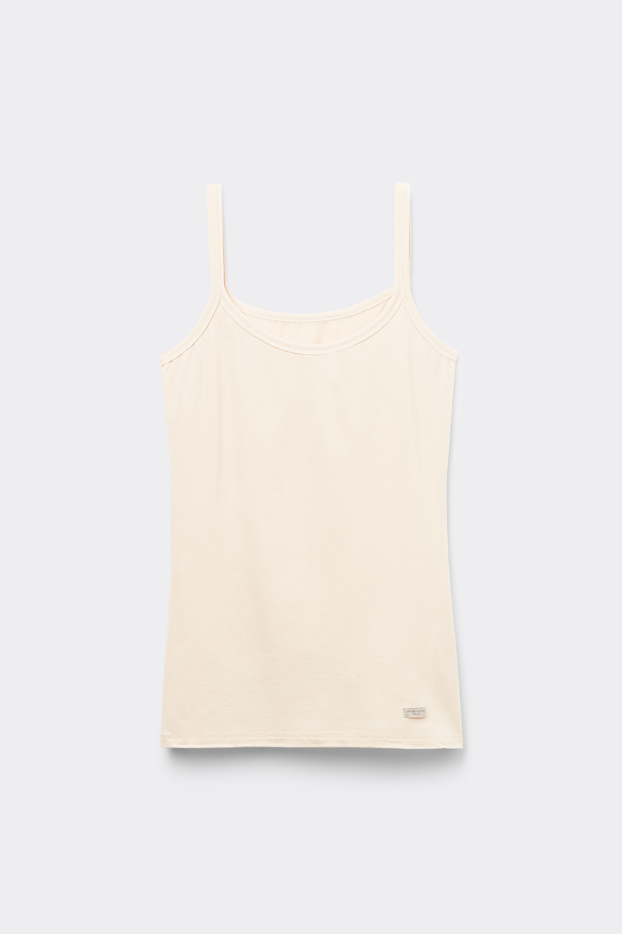 Топ на тонких бретелях, выполненный из мягкого хлопка. Благодаря облегающему силуэту эту модель можно носить не только в качестве нательного белья, но и надевать под другие трикотажные изделия. Рост модели: 179 см. Размер изделия на фотографии: S.