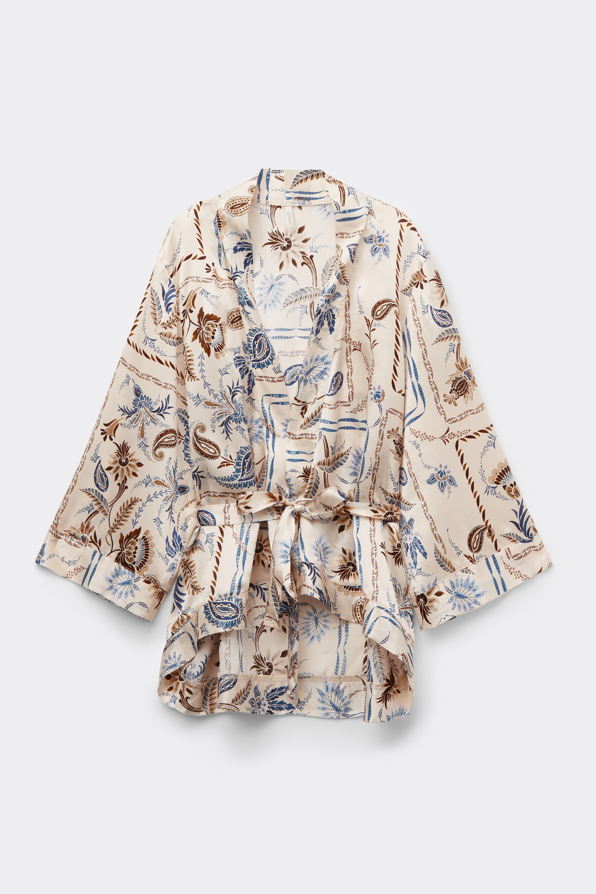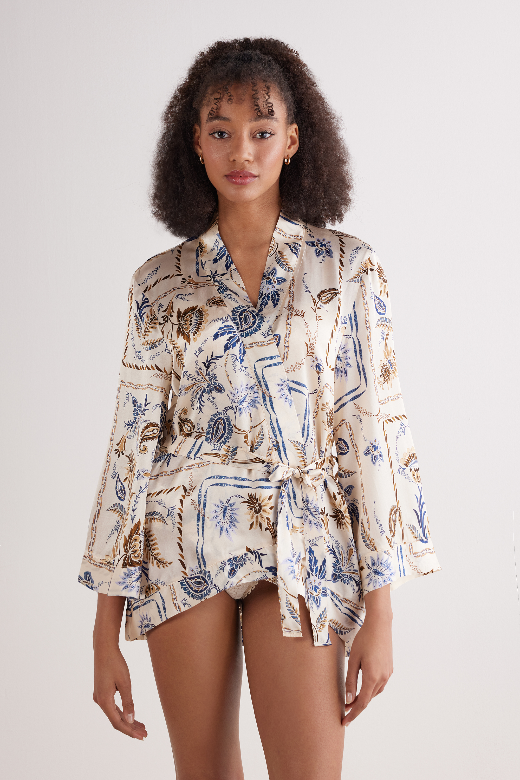 Короткое кимоно из шелкового сатина с принтом, напоминающим узоры в стиле средиземноморской майолики. Модель можно использовать как элегантный домашний халат или гламурный жакет.