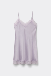 Шелковая комбинация с V-образным вырезом на тонких регулируемых бретелях. Линия декольте и нижний край изделия выполнены из кружева.