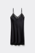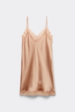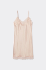 Шелковая комбинация с V-образным вырезом на тонких регулируемых бретелях. Линия декольте и нижний край изделия выполнены из кружева.