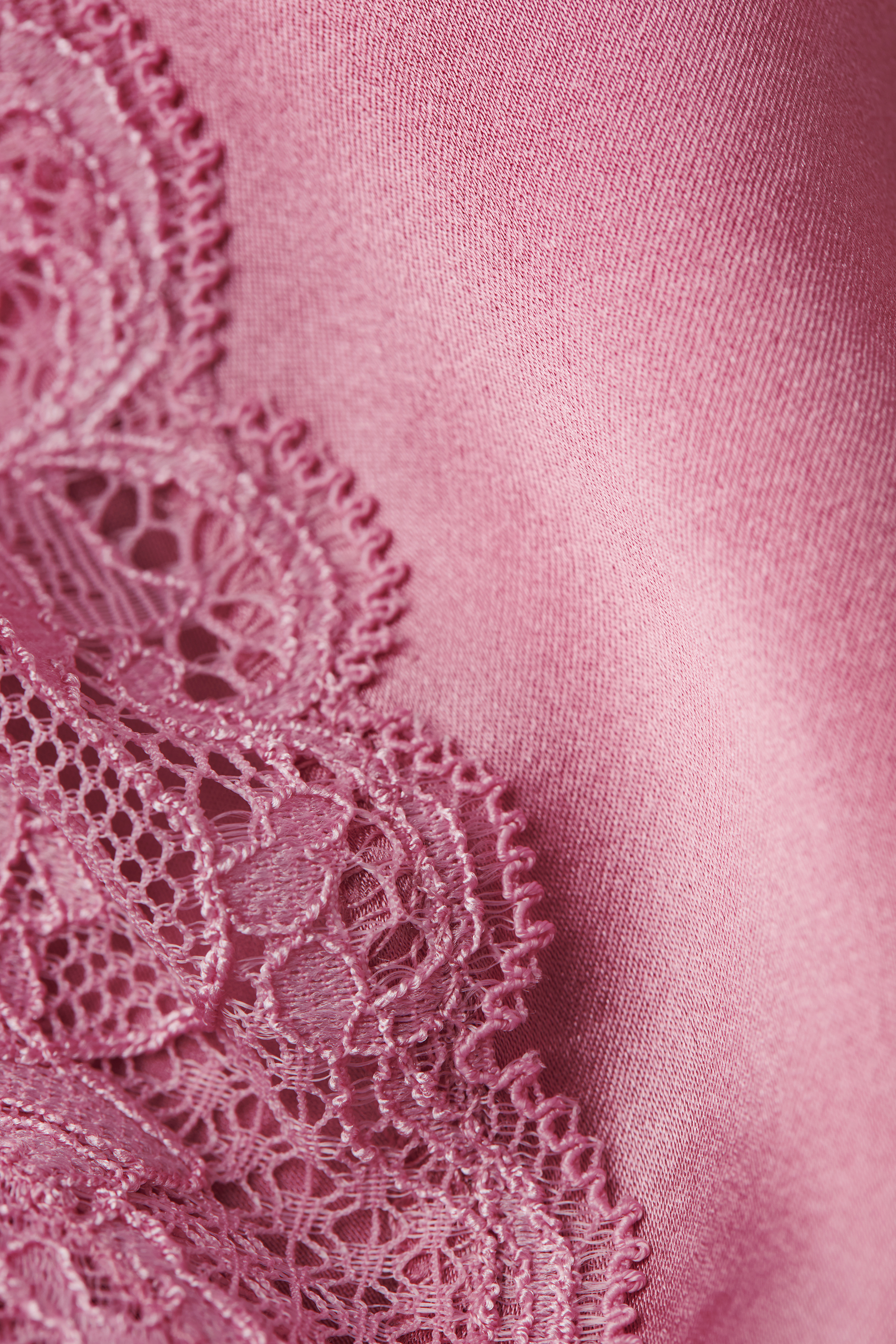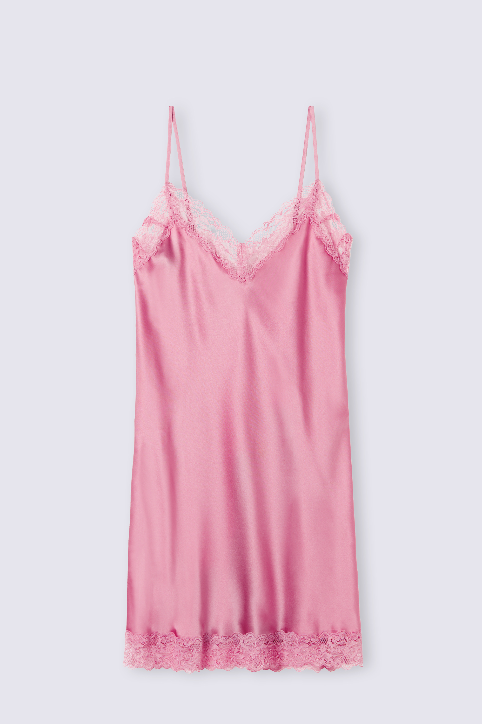 Шелковая комбинация с V-образным вырезом на тонких регулируемых бретелях. Линия декольте и нижний край изделия выполнены из кружева.