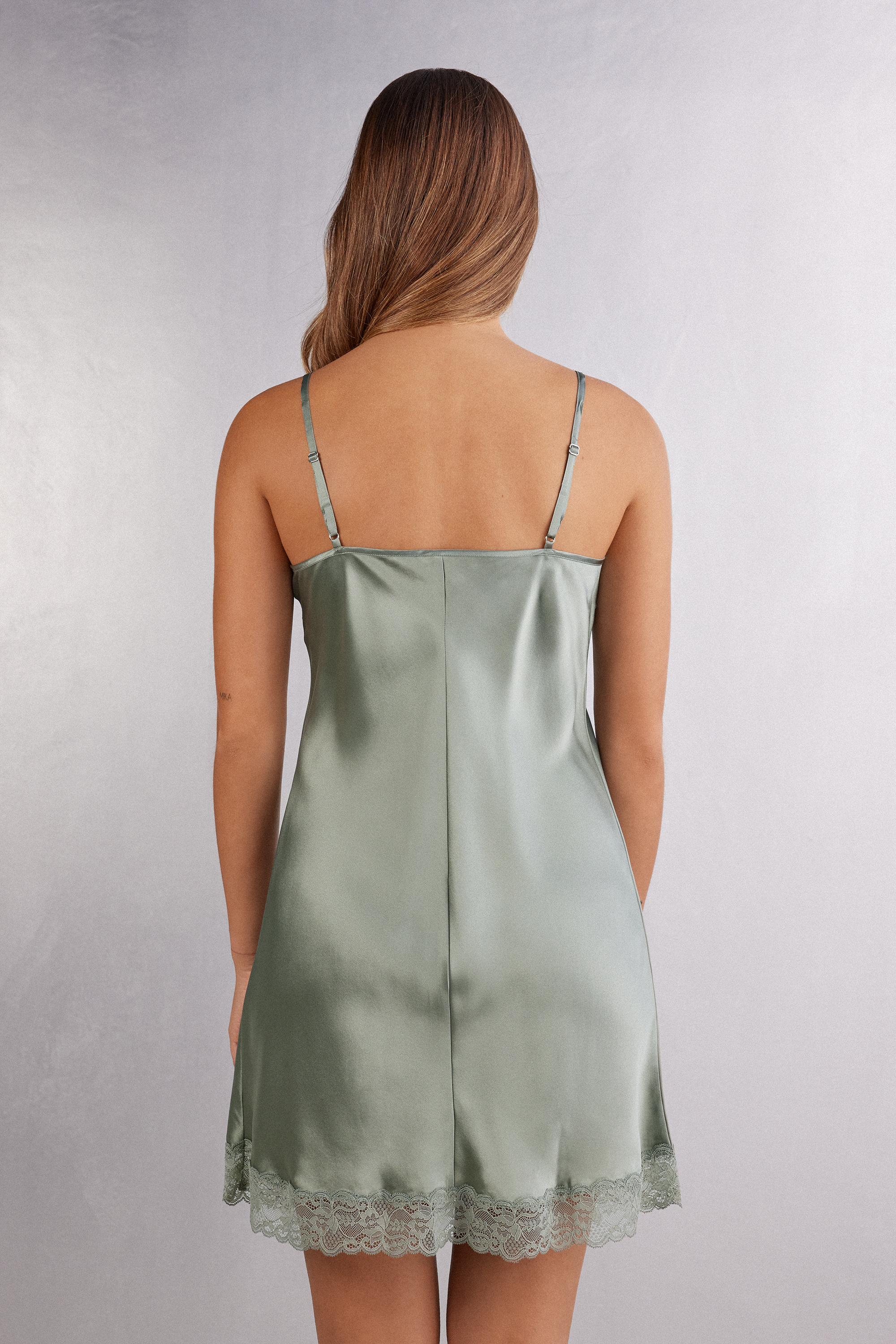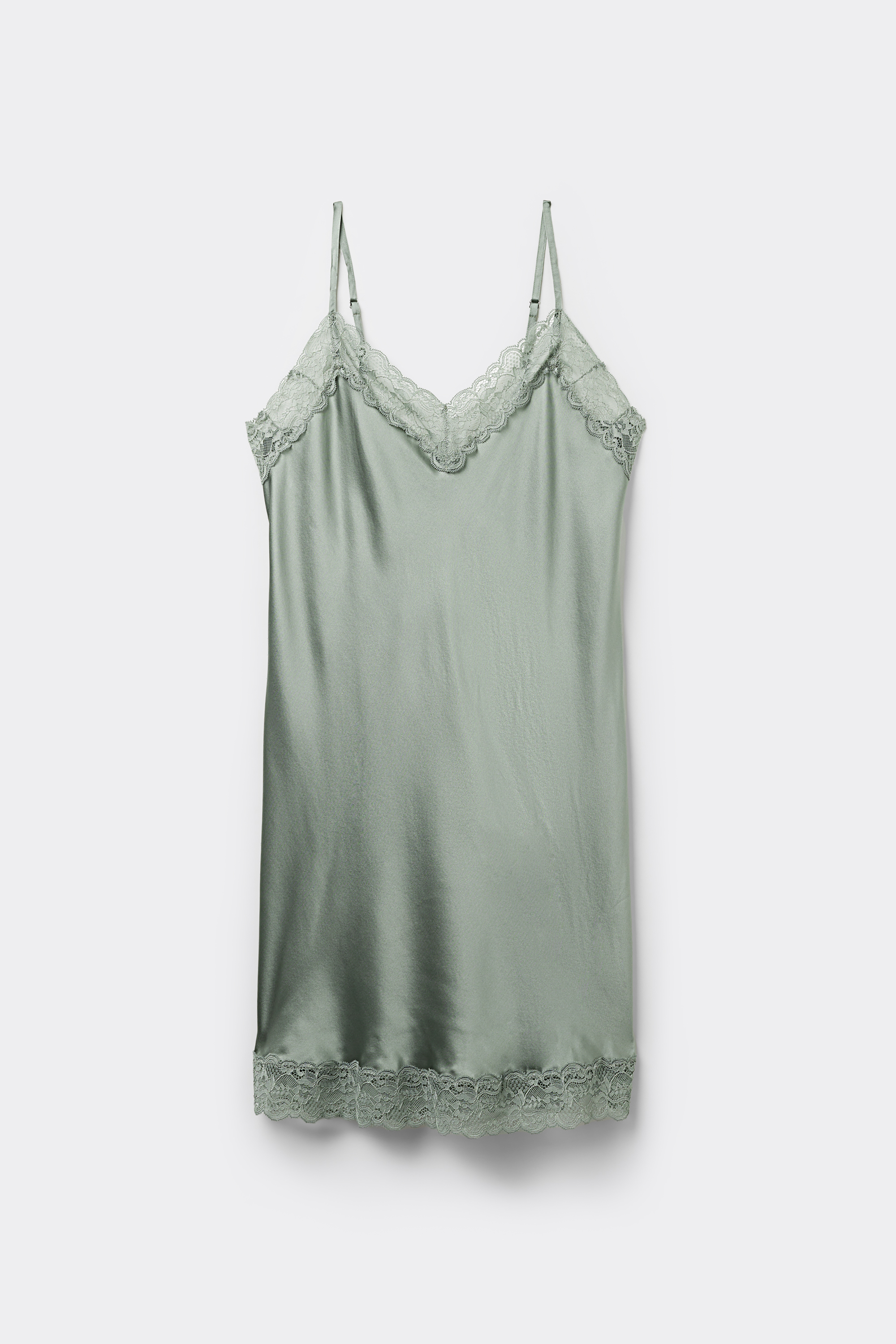 Шелковая комбинация с V-образным вырезом на тонких регулируемых бретелях. Линия декольте и нижний край изделия выполнены из кружева.