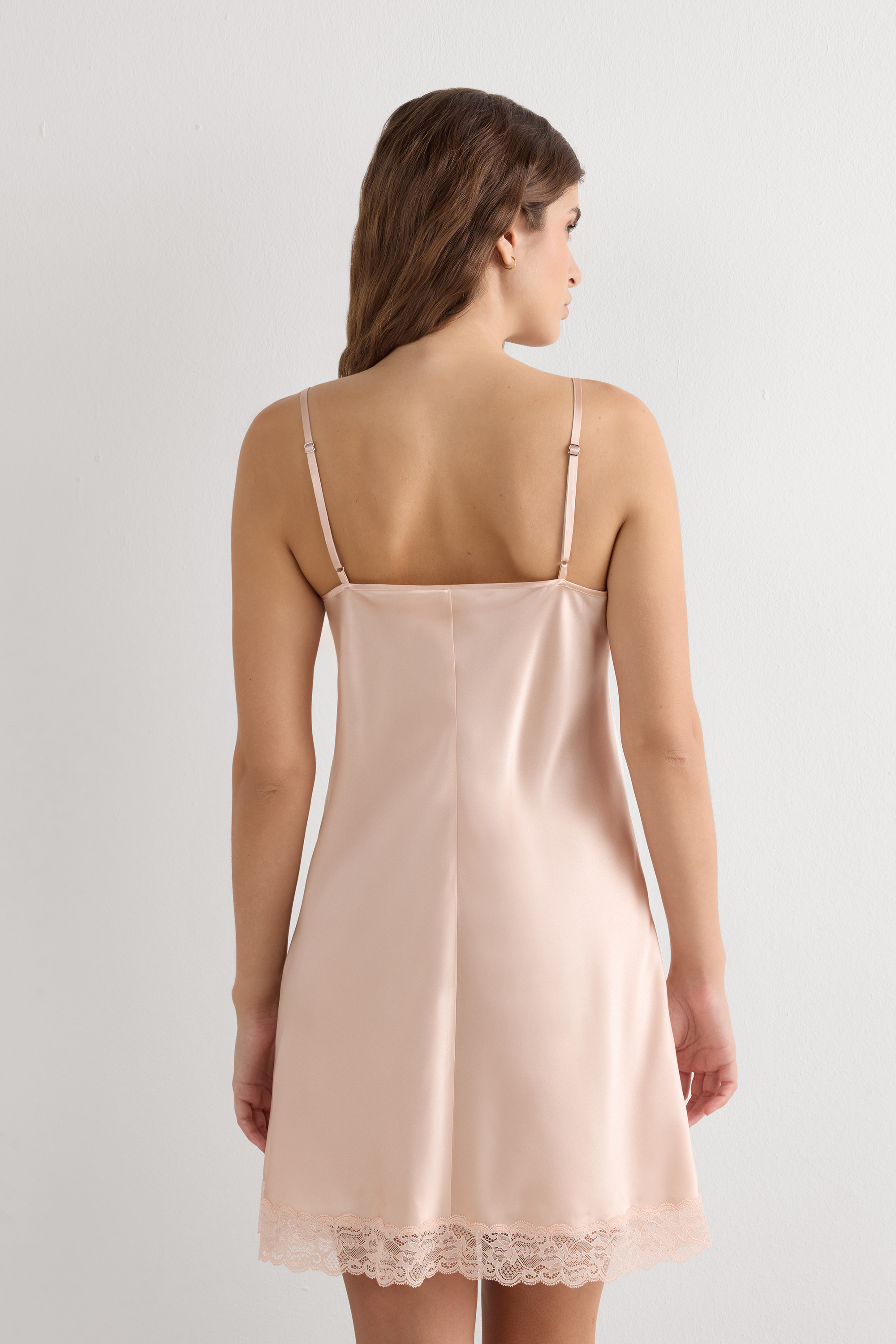 Шелковая комбинация с V-образным вырезом на тонких регулируемых бретелях. Линия декольте и нижний край изделия выполнены из кружева.