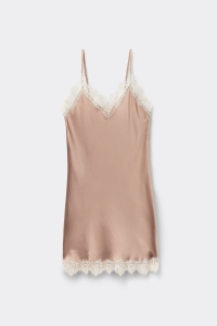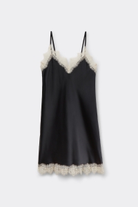 Комбинация из шелкового сатина с элегантной каймой из ресничного кружева контрастного цвета. Эту женственную модель можно использовать не только как одежду для сна, но и как платье — для создания гламурного образа.