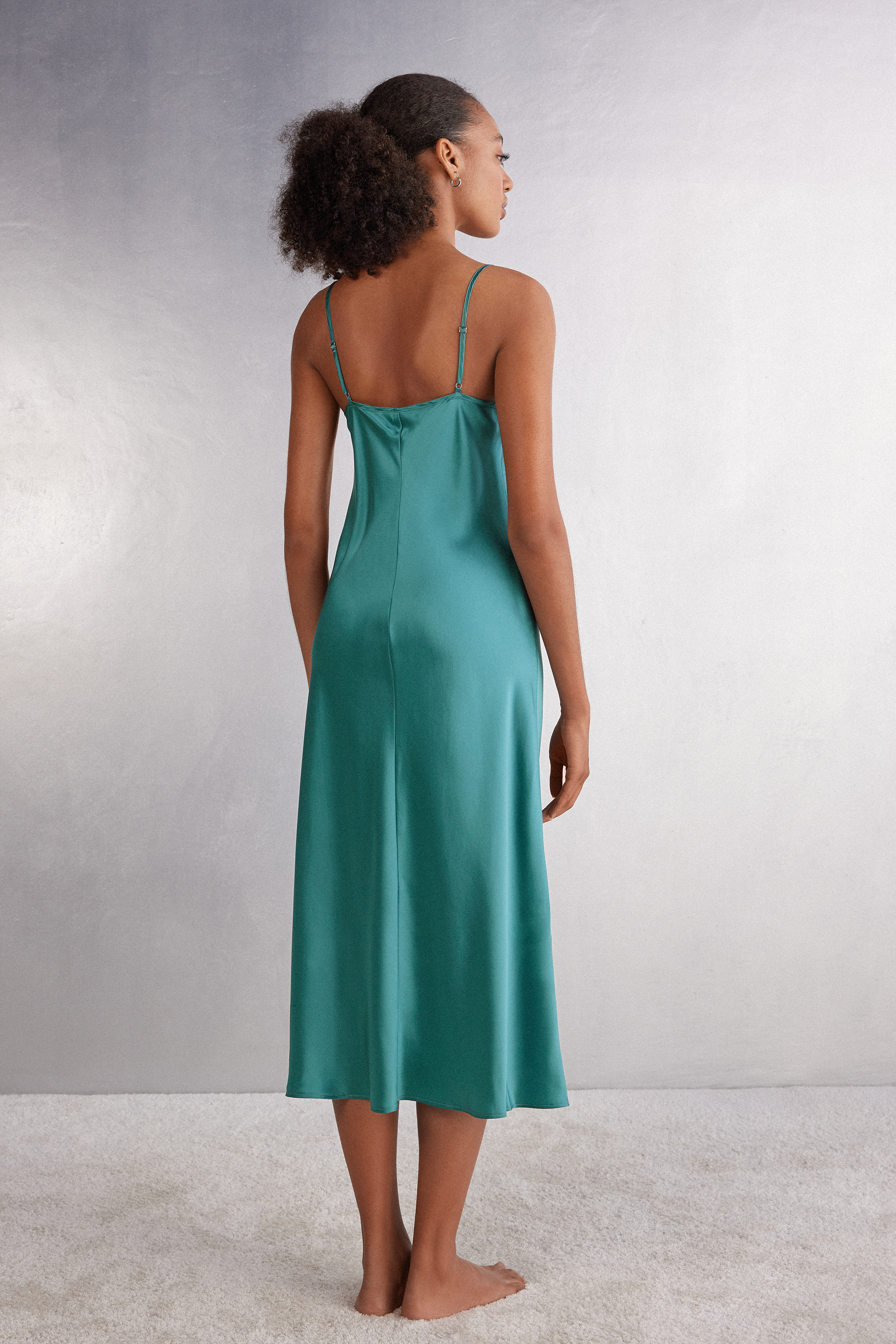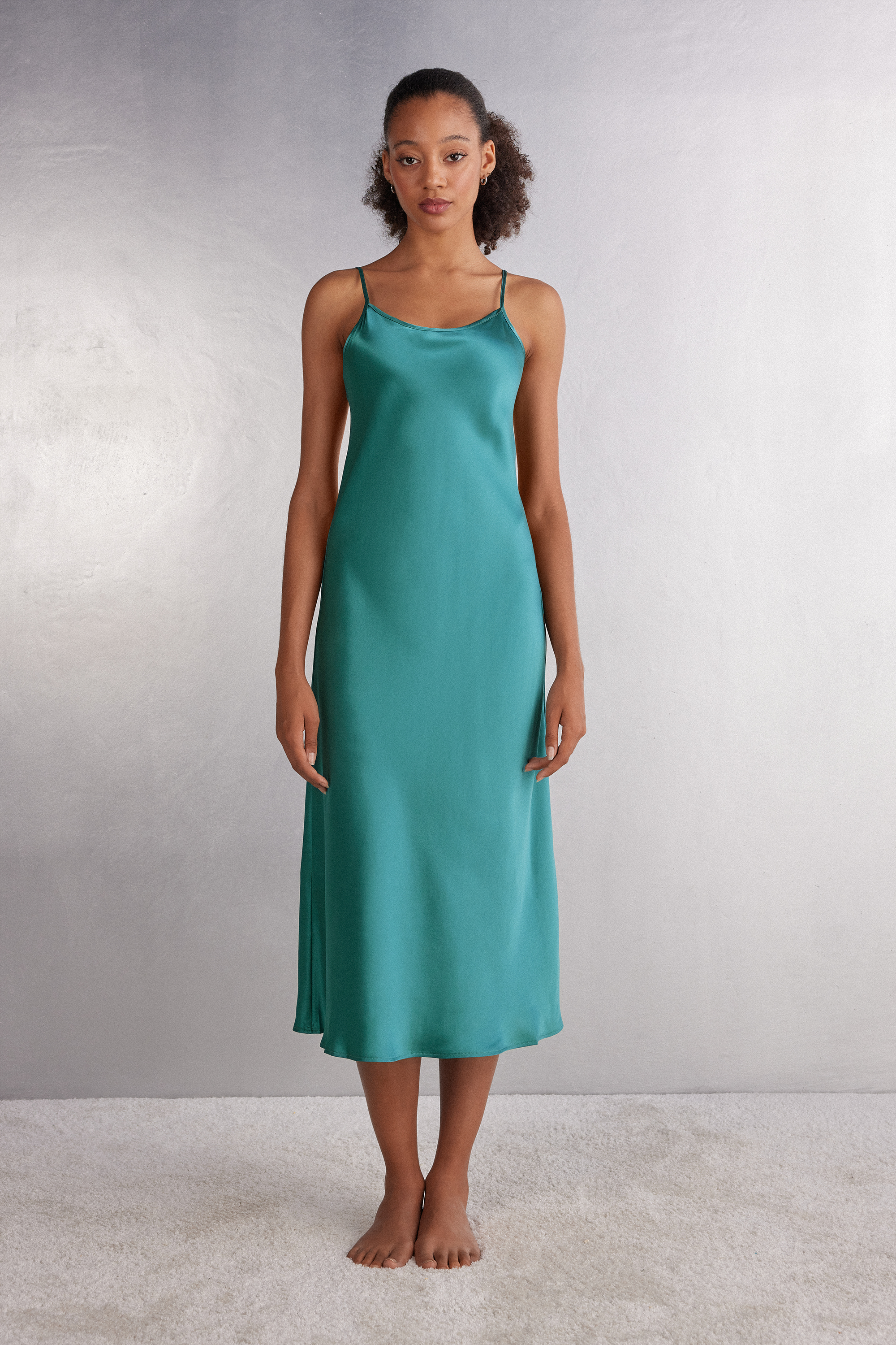 Длинная комбинация из гладкого шелка с круглым вырезомна тонких регулируемых бретелях. Идеально сочетается с длинными платьями, позволяет создать изящный силуэт. Может использоваться в качестве самостоятельного предмета одежды. Эффектно смотрится с изысканными аксессуарами.