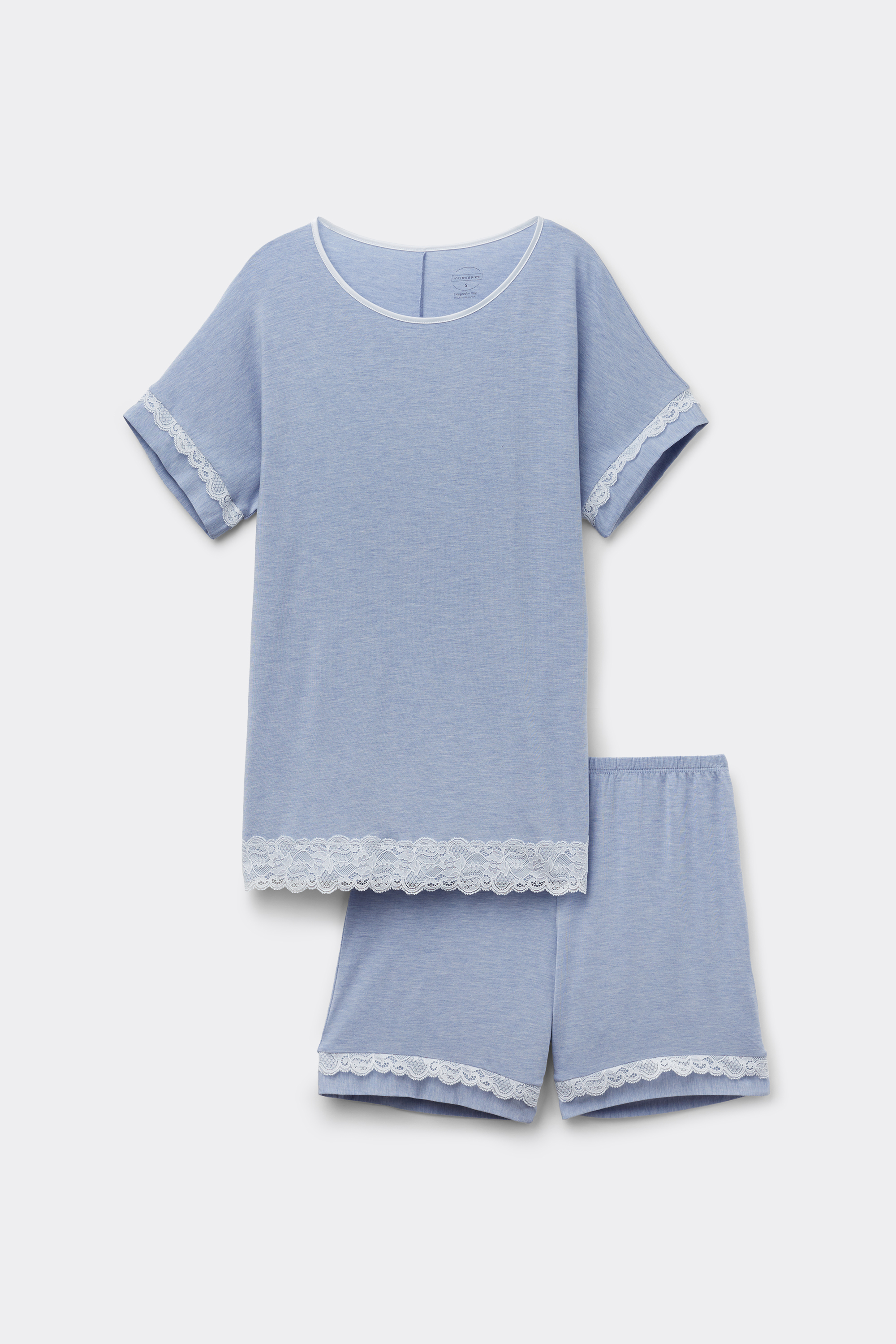 Короткая пижама, выполненная из мягкого модала, отделана романтичной кружевной каймой.