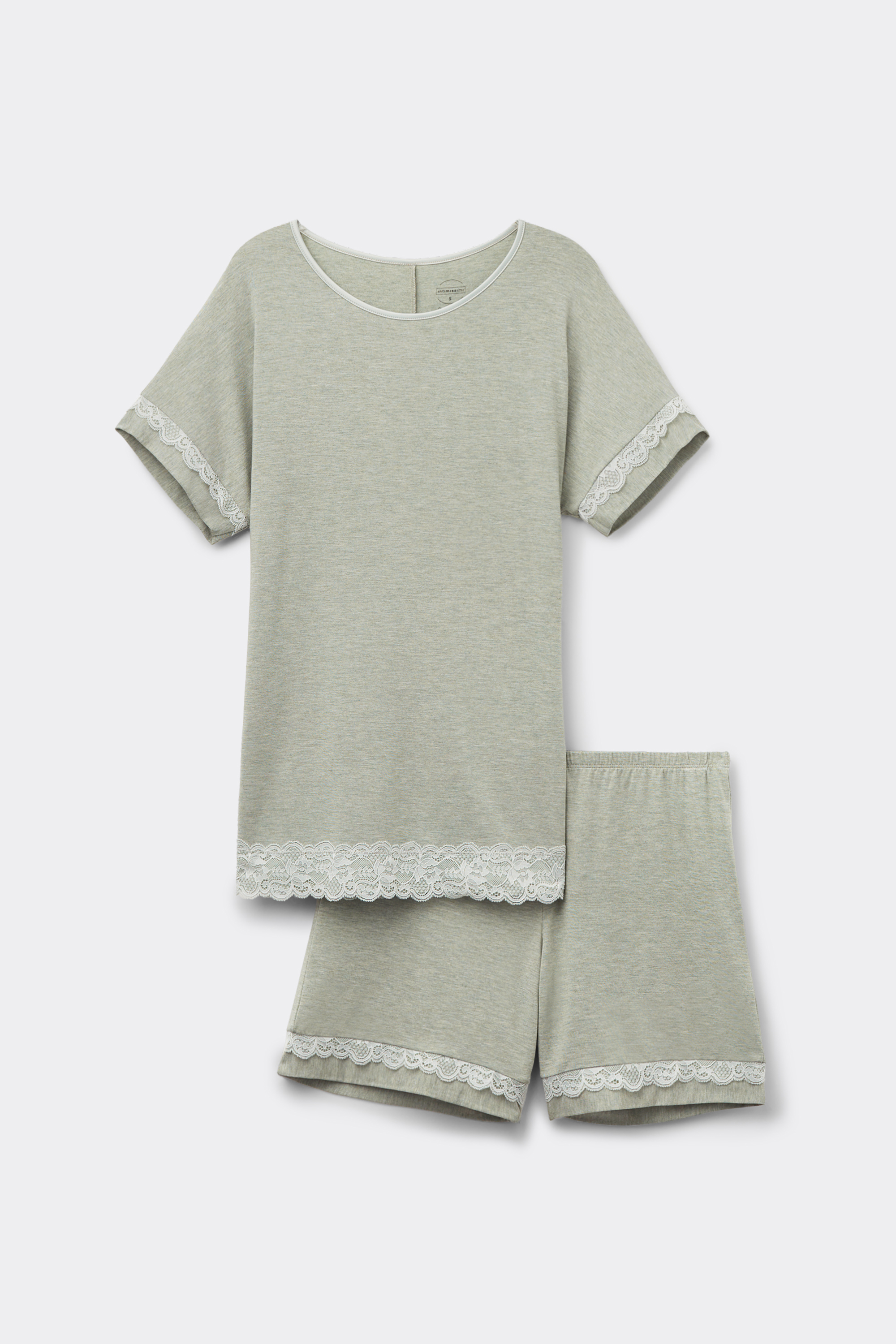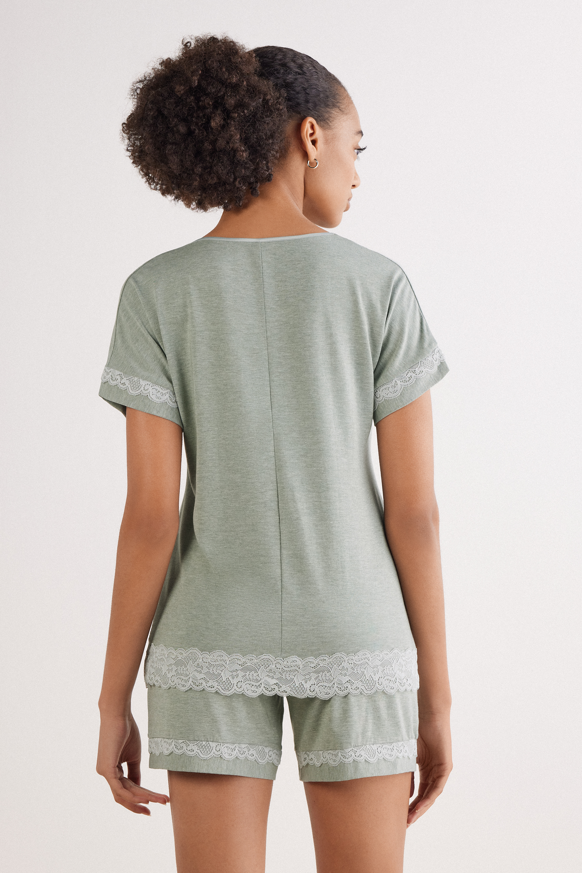 Короткая пижама, выполненная из мягкого модала, отделана романтичной кружевной каймой.