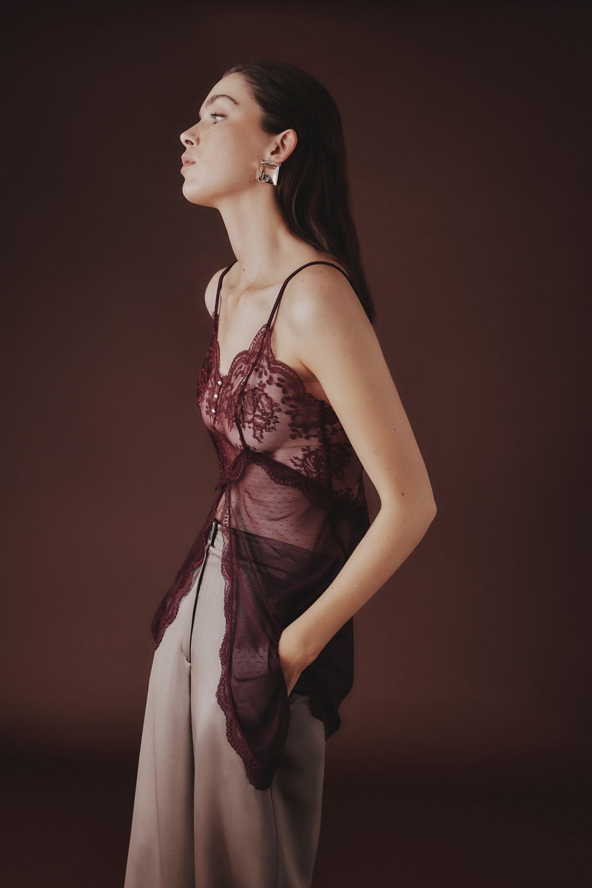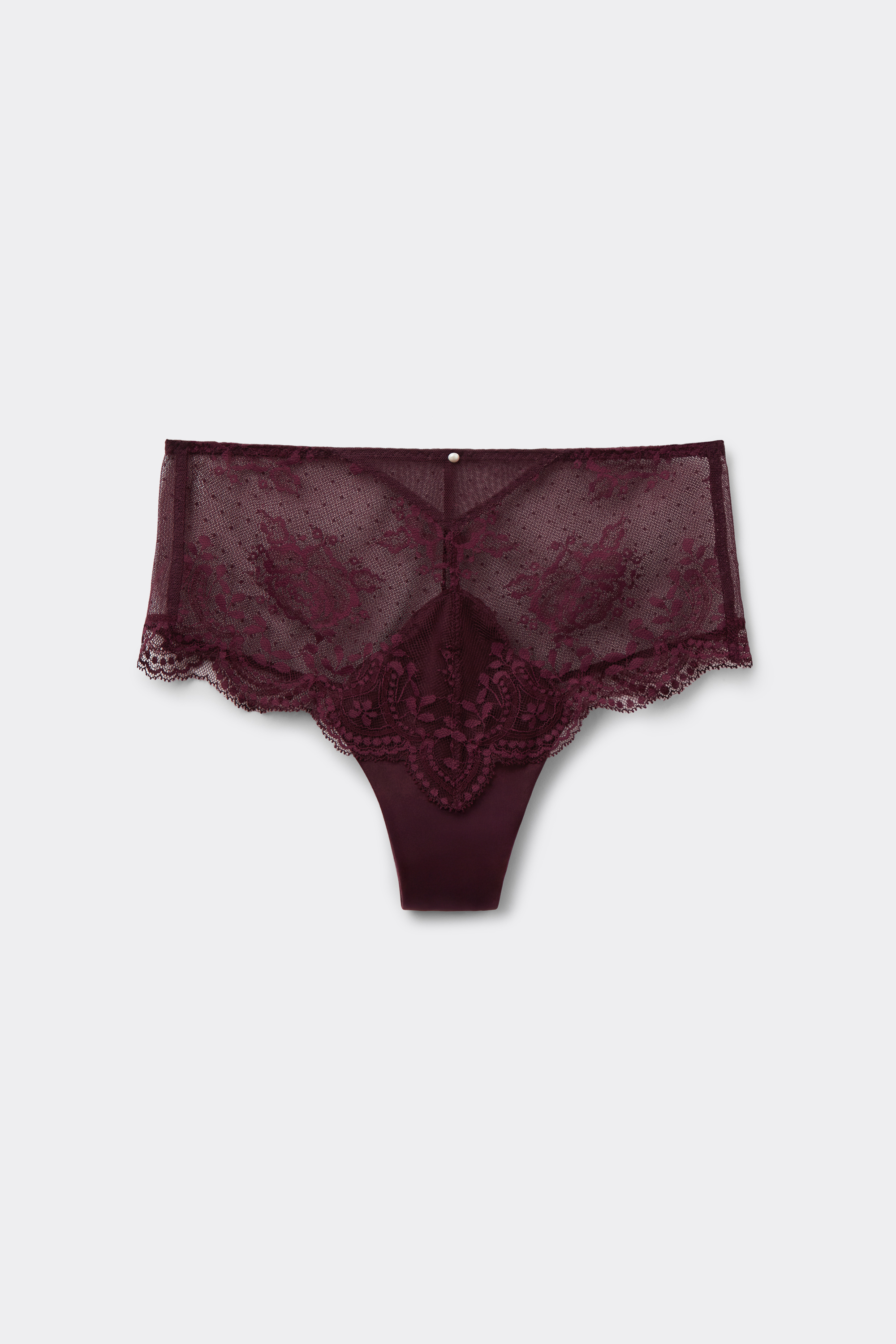 Кюлоты бразильяно из кружева и тюля с точечной вышивкой. Элегантная отделка из блестящей микрофибры с атласной фактурой. Небольшая пуговица с эффектом жемчуга на поясе придает модели романтические нотки.