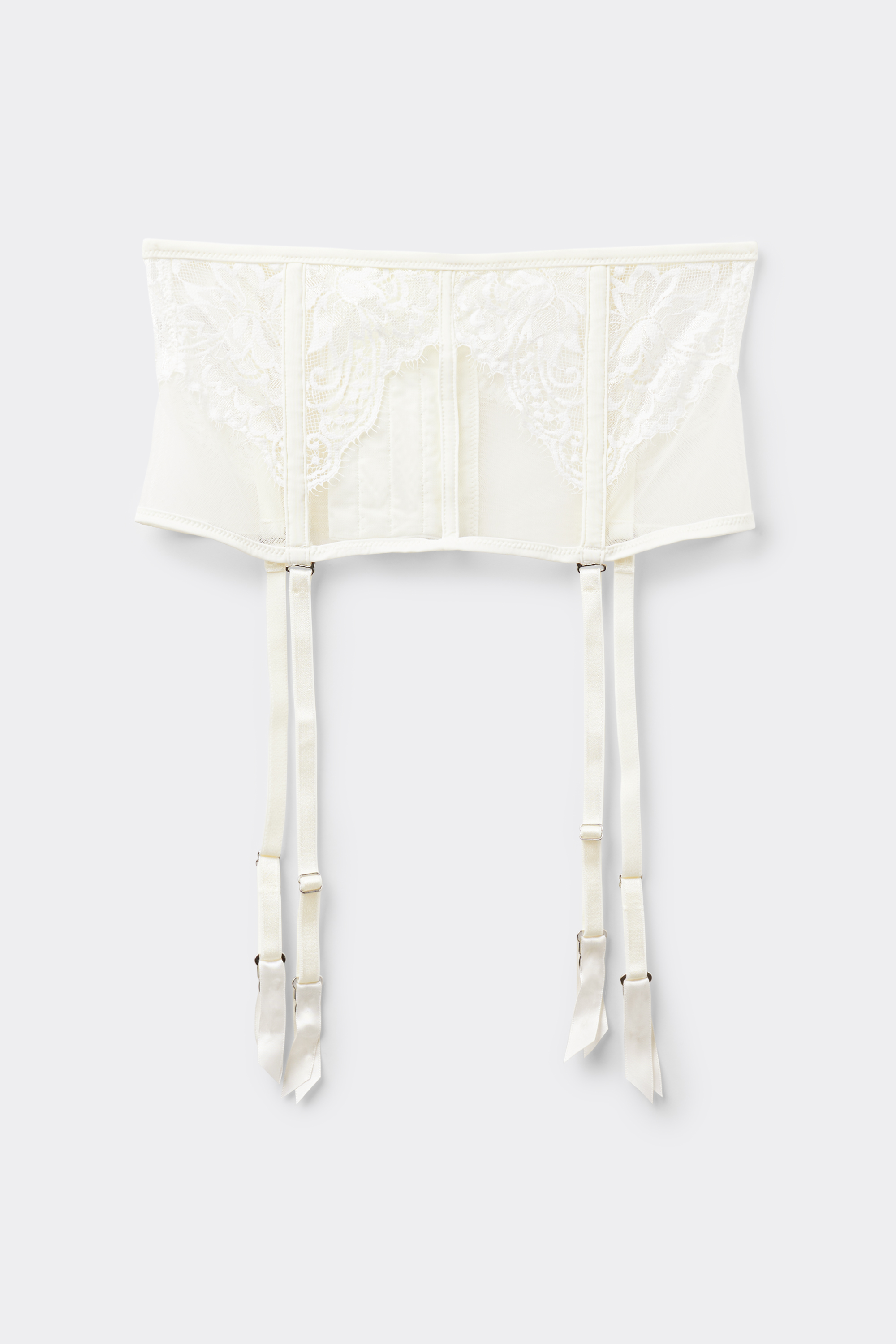 Пояс для чулок, выполненный из ресничного кружева и тюля, в стиле корсета. Косточки, обтянутые микрофиброй, придают модели особую чувственность. Этот гламурный аксессуар можно надевать поверх рубашки или облегающего топа.
