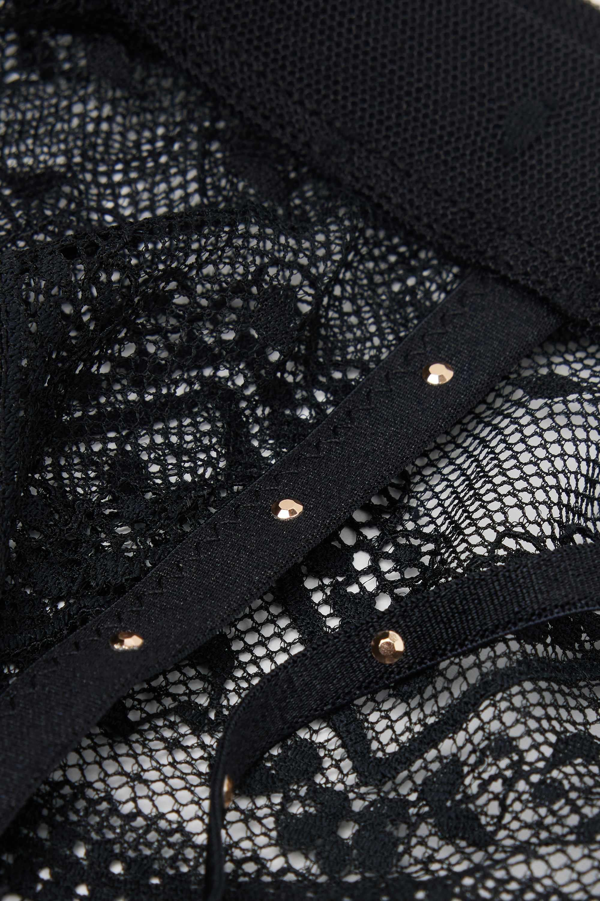 Пояс для чулок, выполненный из мягкого эластичного кружева. Отделка из тюля с точечной вышивкой. Мягкие эластичные тесемки украшены заклепками. Изящный бантик с золотистым декором.