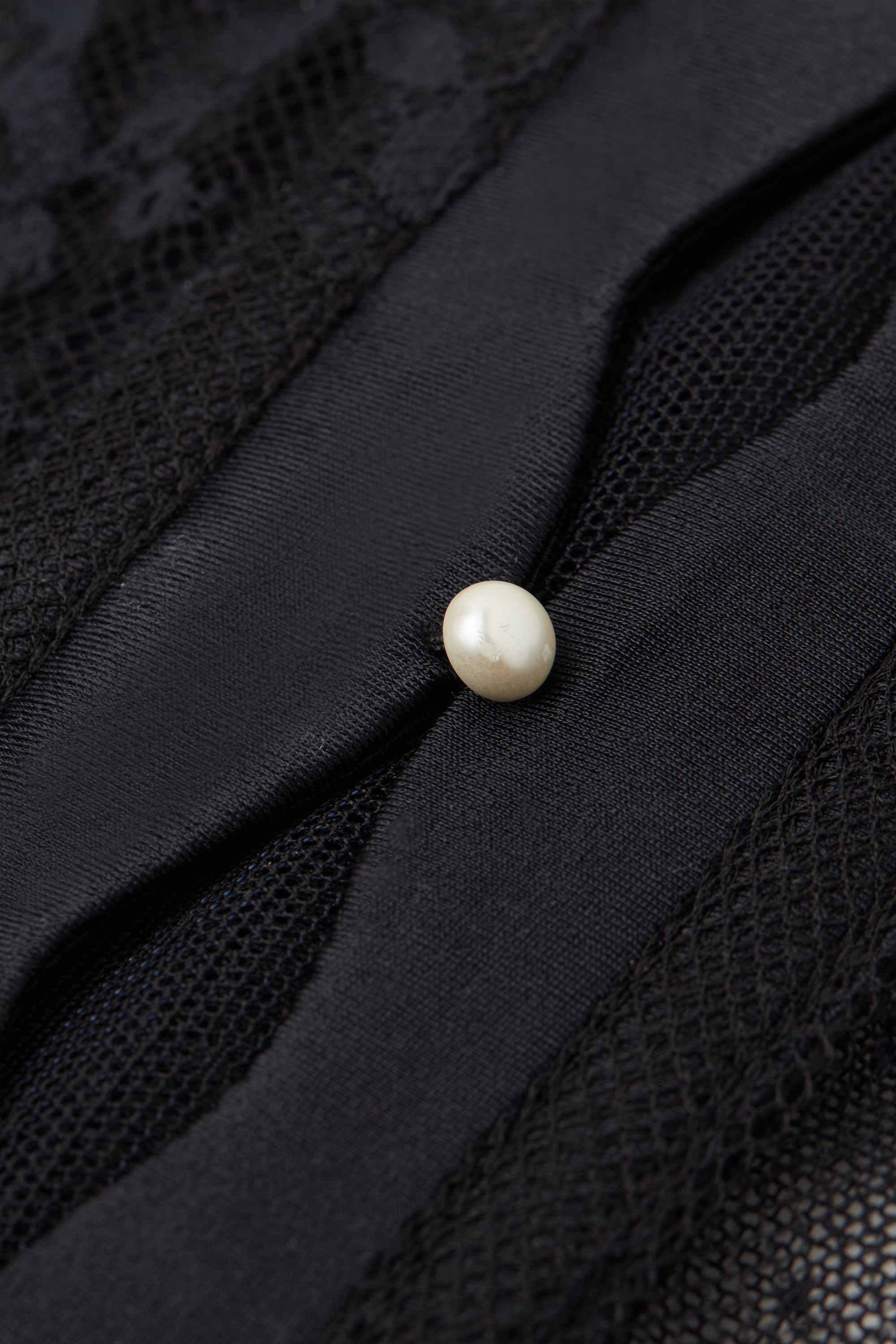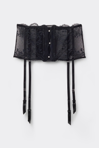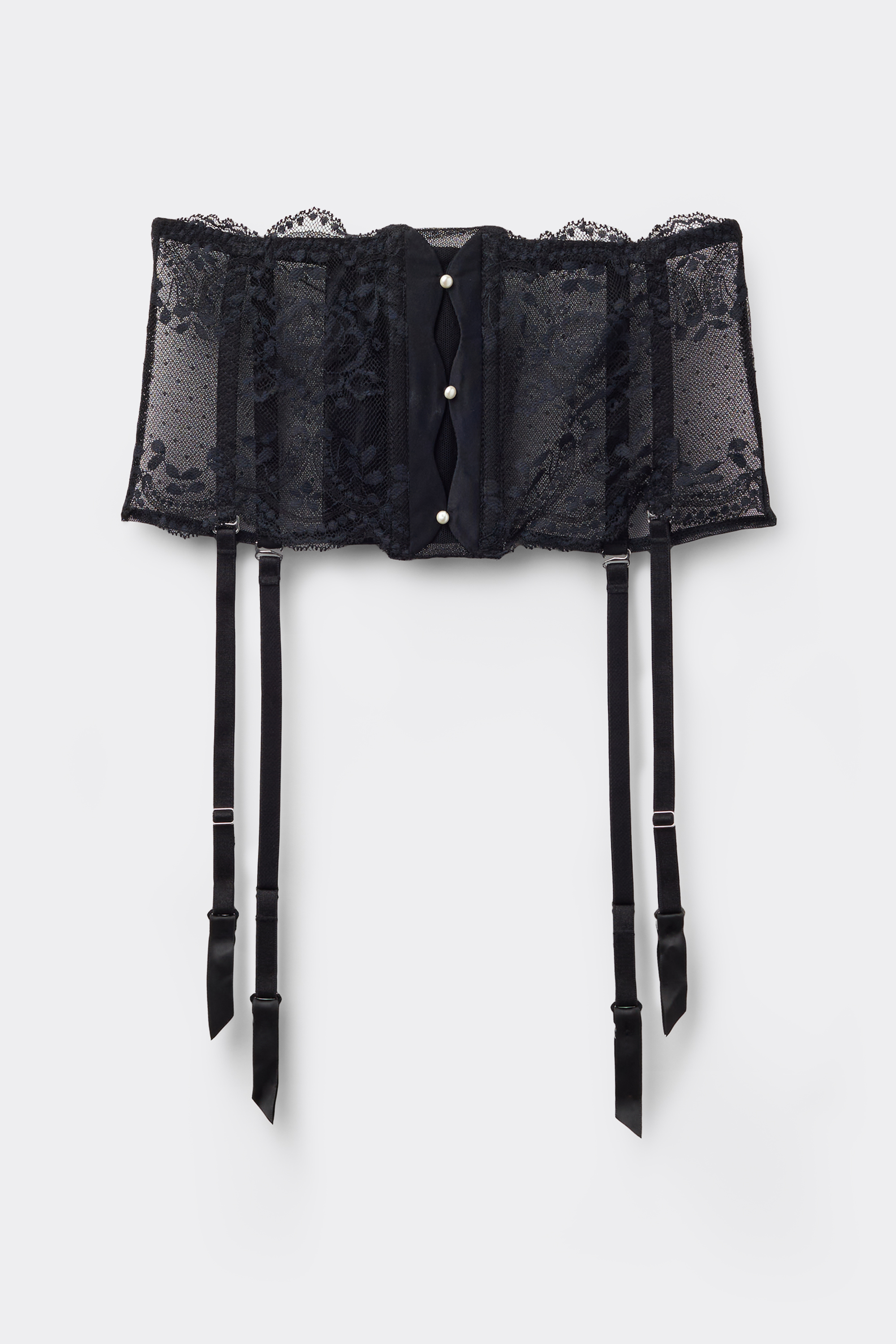 Кружевной пояс для чулок, выполненный в стиле корсета, с элегантной отделкой из блестящей микрофибры. Небольшие пуговицы с эффектом жемчуга придают изделию романтические нотки. Этот гламурный аксессуар можно надевать поверх рубашки или облегающего топа.
