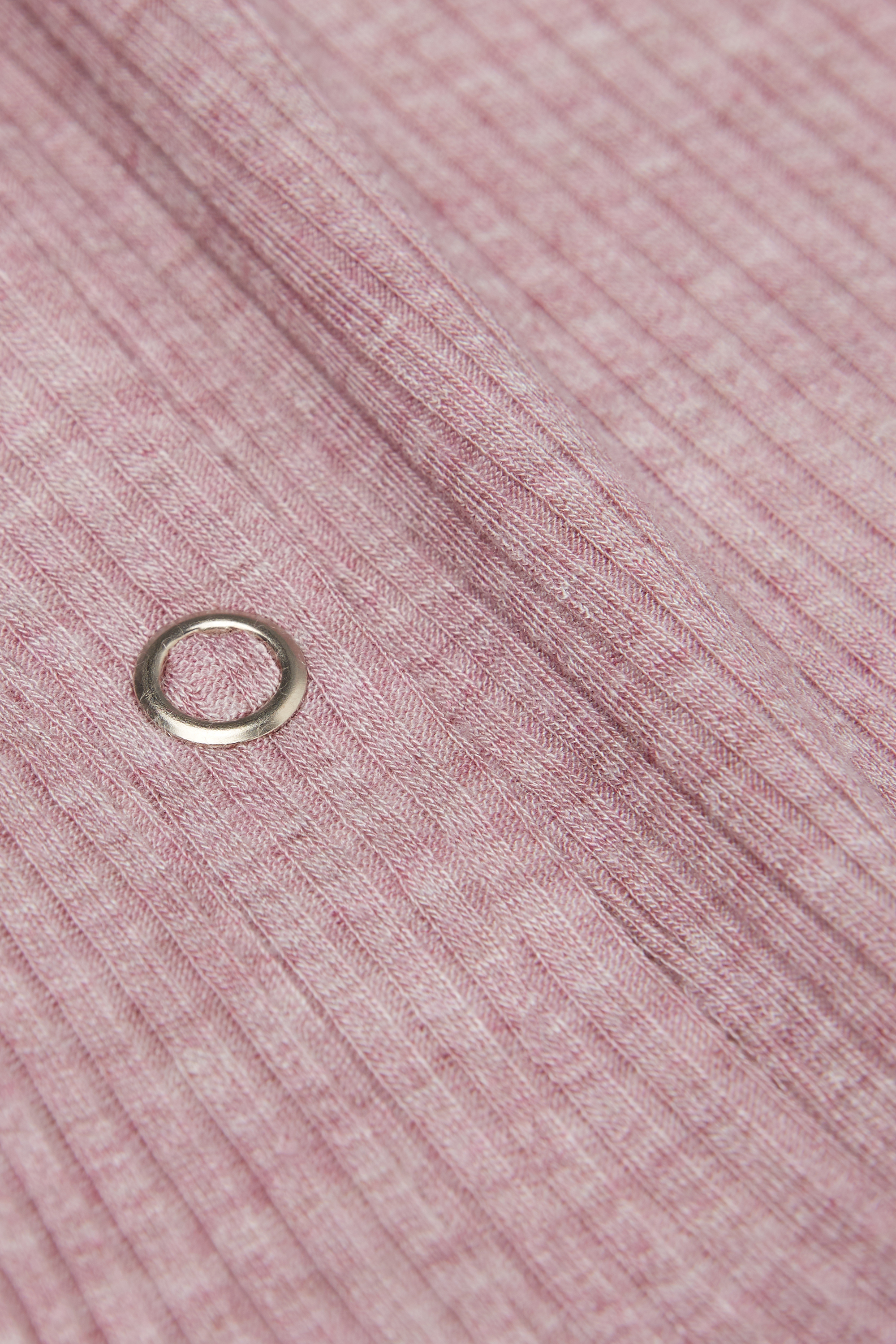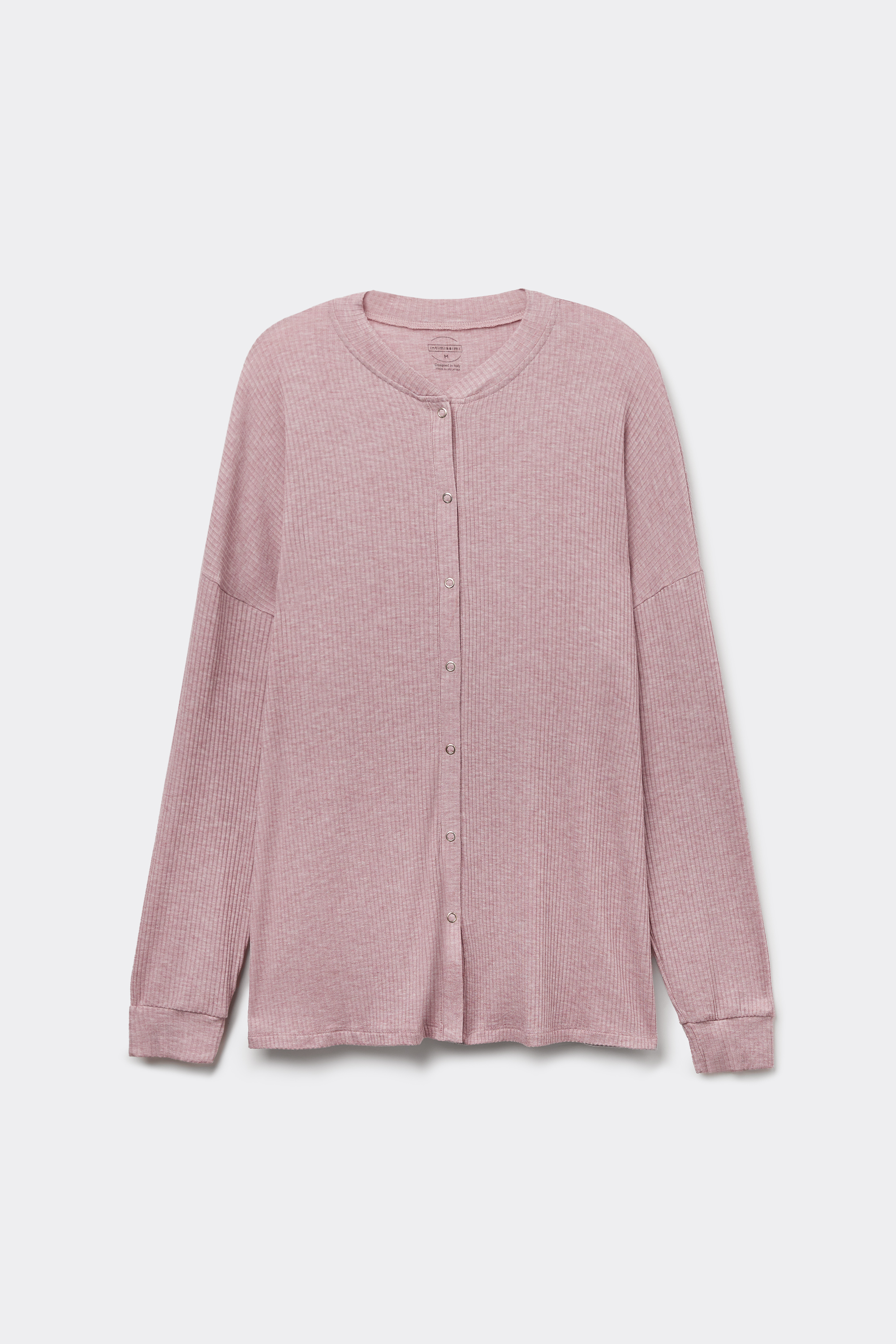 Рубашка из мягкого модала в рубчик. Спереди кнопочная застежка. Можно носить расстегнутой поверх майки или топа.