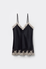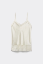 Топ с V-образным вырезом из шелкового атласа. Спереди и сзади отделка кружевом по низу и вдоль выреза. В различных вариантах расцветки кружево может быть контрастным или тон в тон. Тонкие бретели из шелка полностью регулируются. Стандартная посадка.