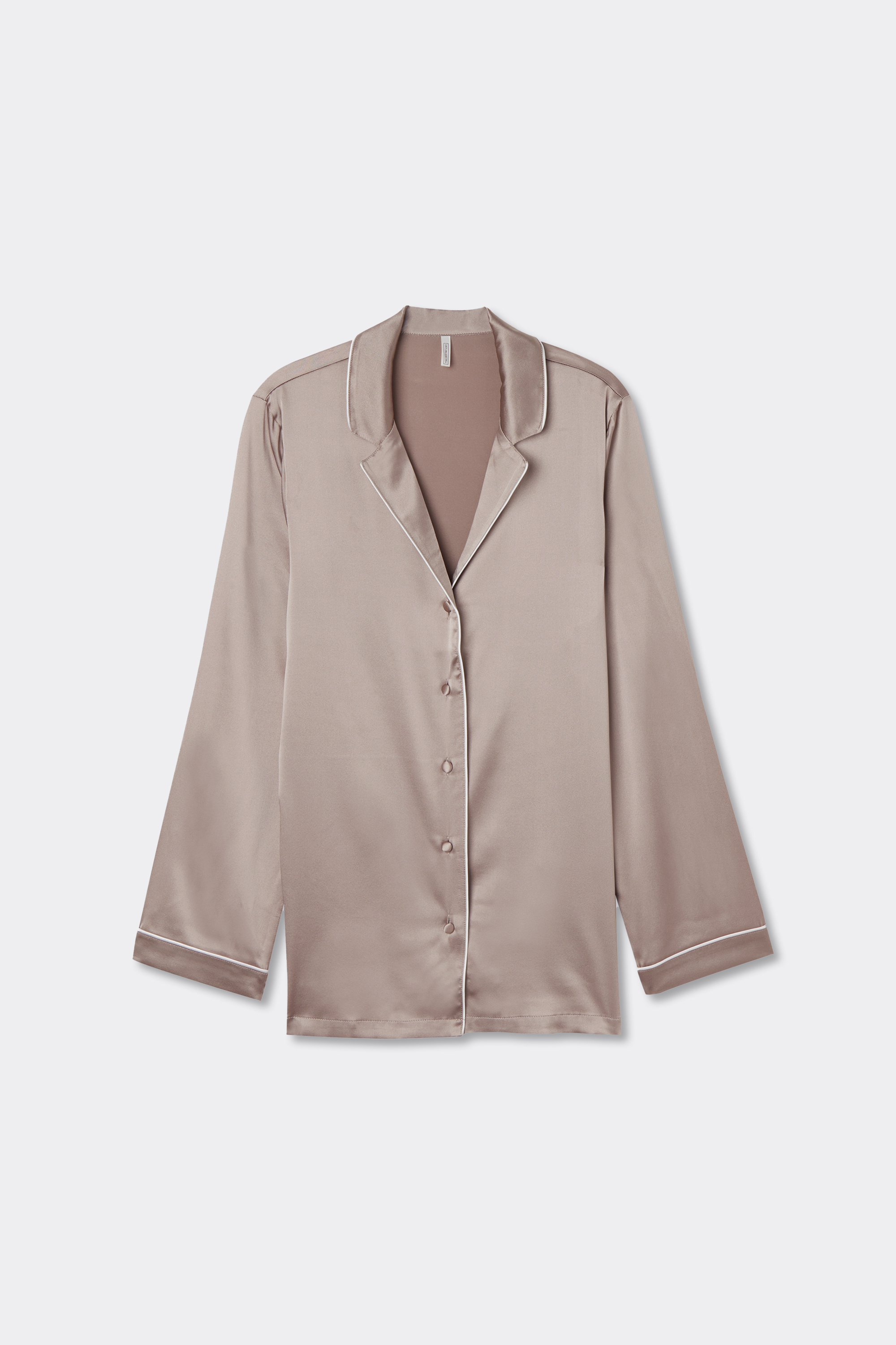 Жакет в мужском стиле, выполненный из слегка эластичного шелкового атласа. В различных вариантах расцветки отделка может быть контрастной или тон в тон. Это элегантное и удобное изделие можно использовать для создания изысканного пижамного комплекта или носить как верхнюю одежду с брюками или джинсами.