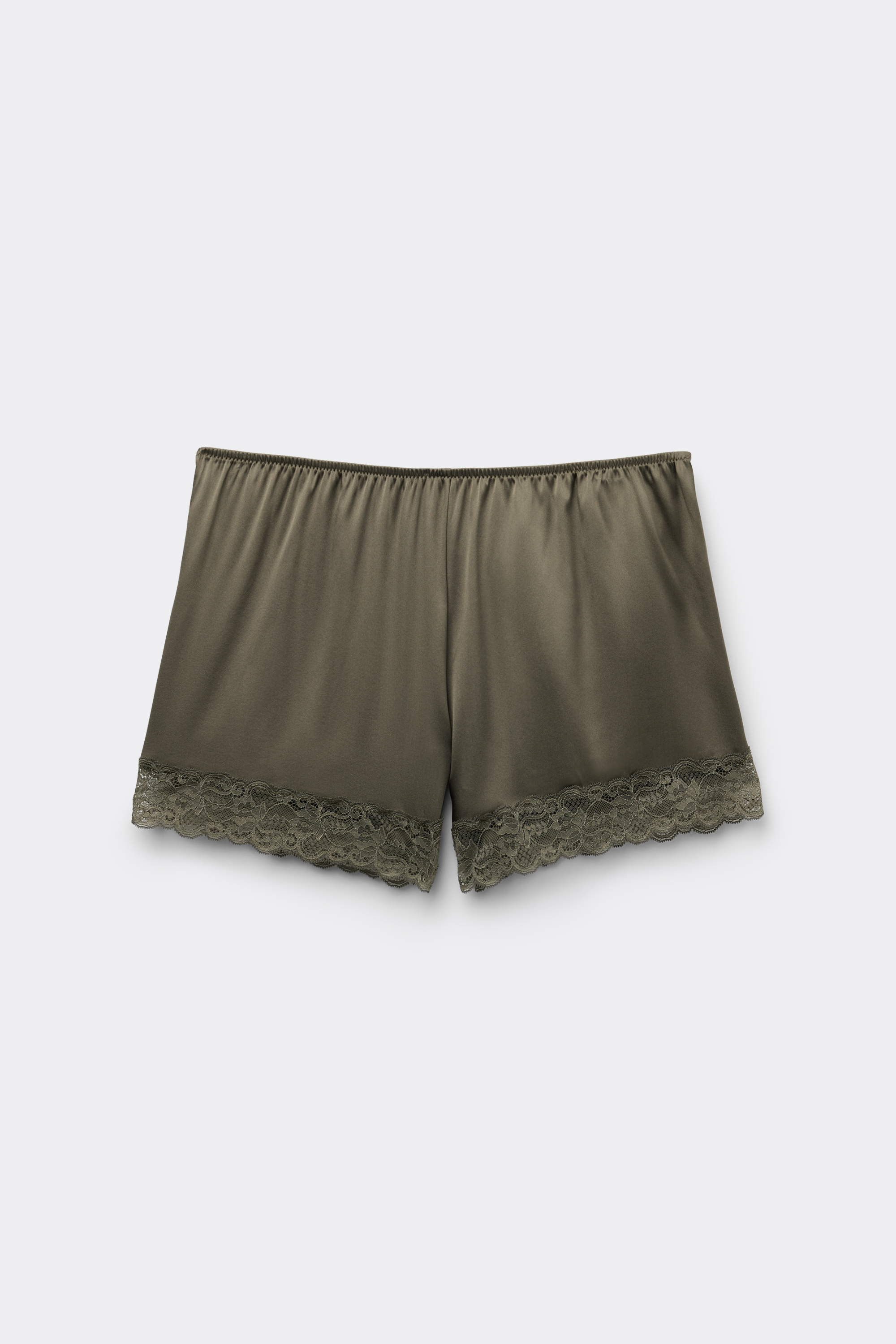 Шорты из слегка эластичного шелкового атласа. Отделка кружевной каймой.