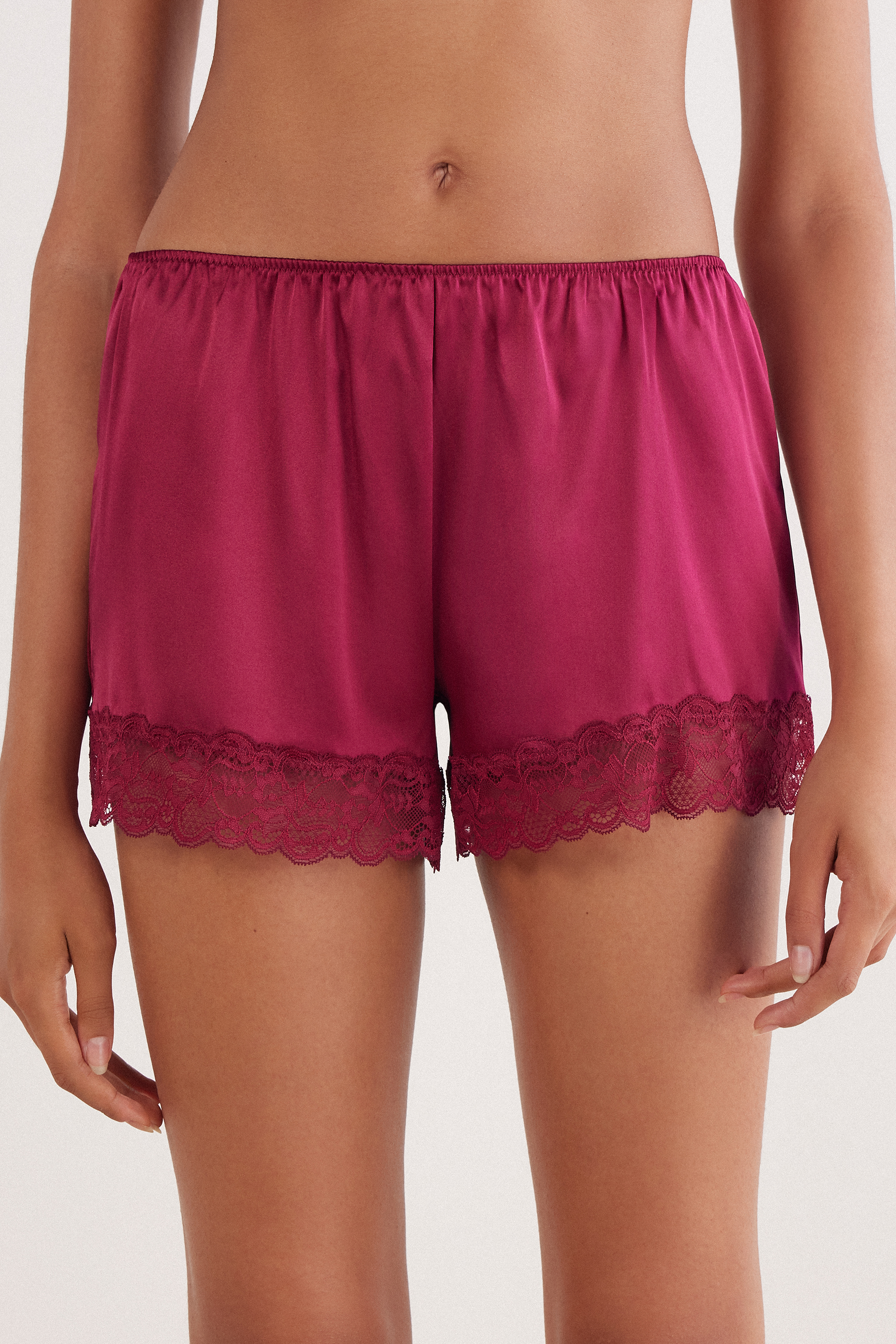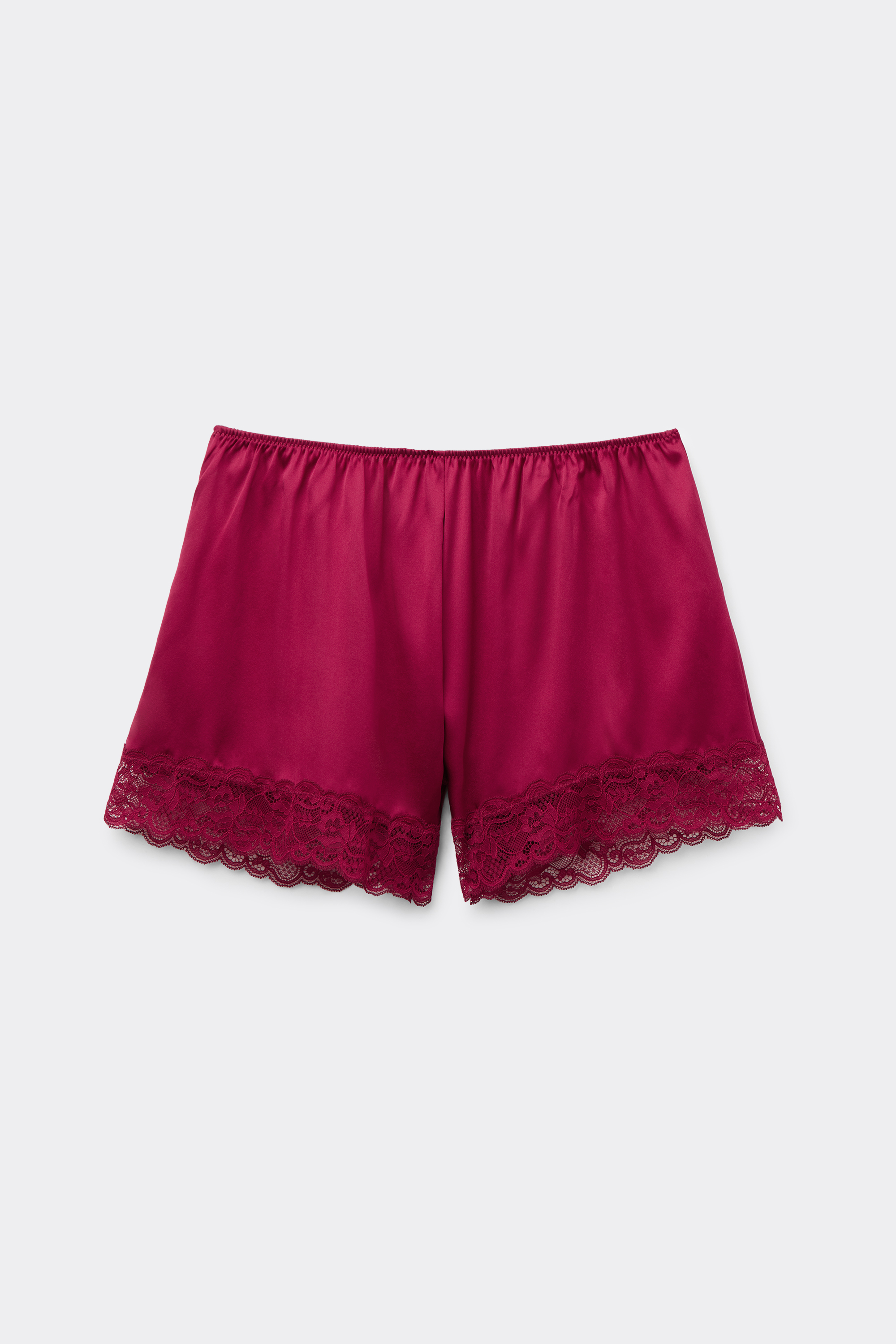Шорты из слегка эластичного шелкового атласа. Отделка кружевной каймой.