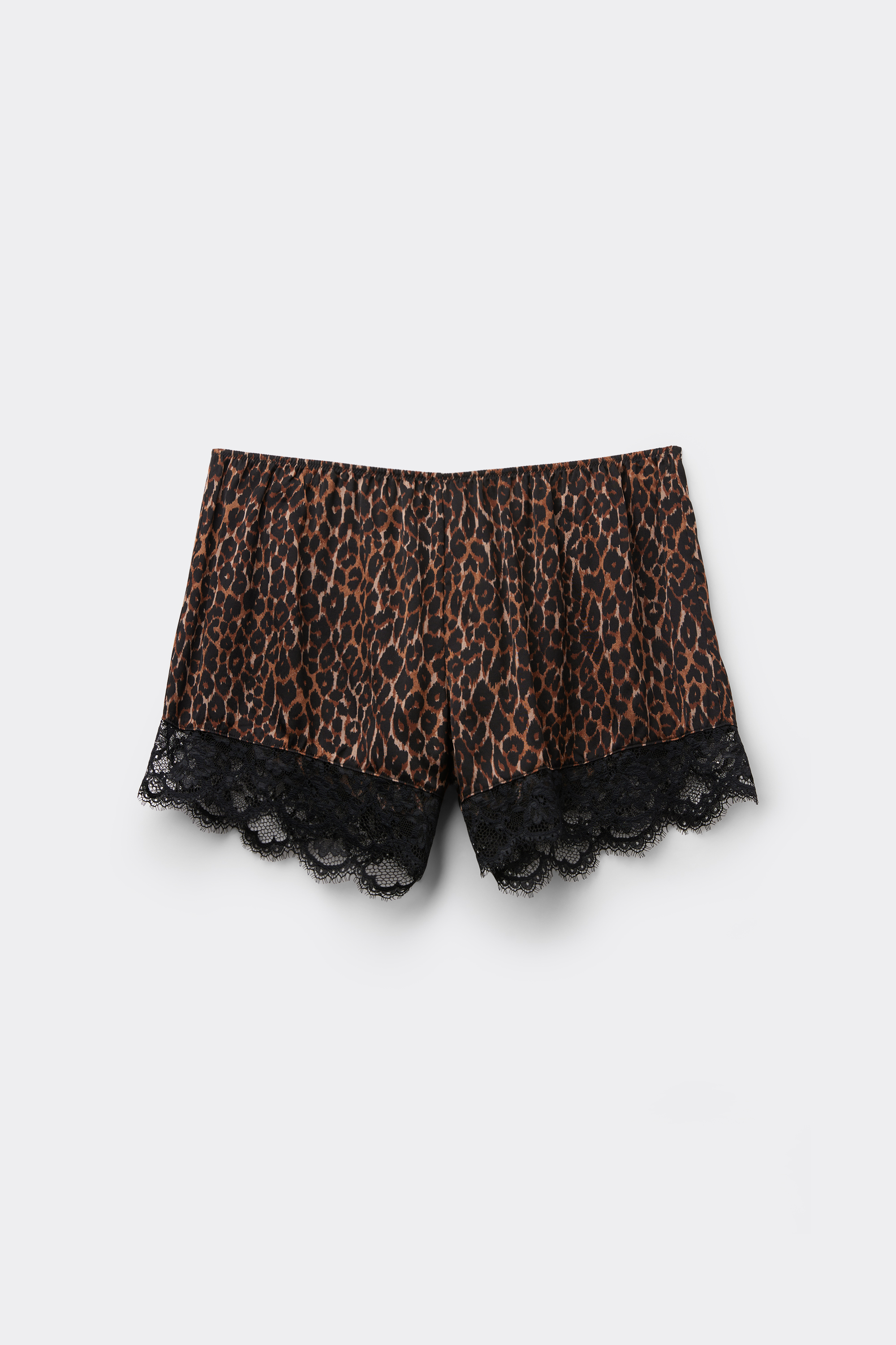 Шорты из вискозного сатина с анималистическим принтом. По низу кружевная кайма.