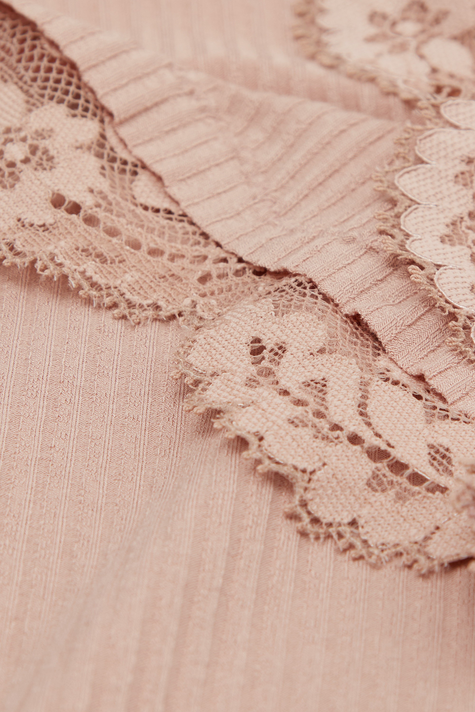 Короткие шорты из мягкой вискозы в рубчик, отделанные кружевной каймой по низу.