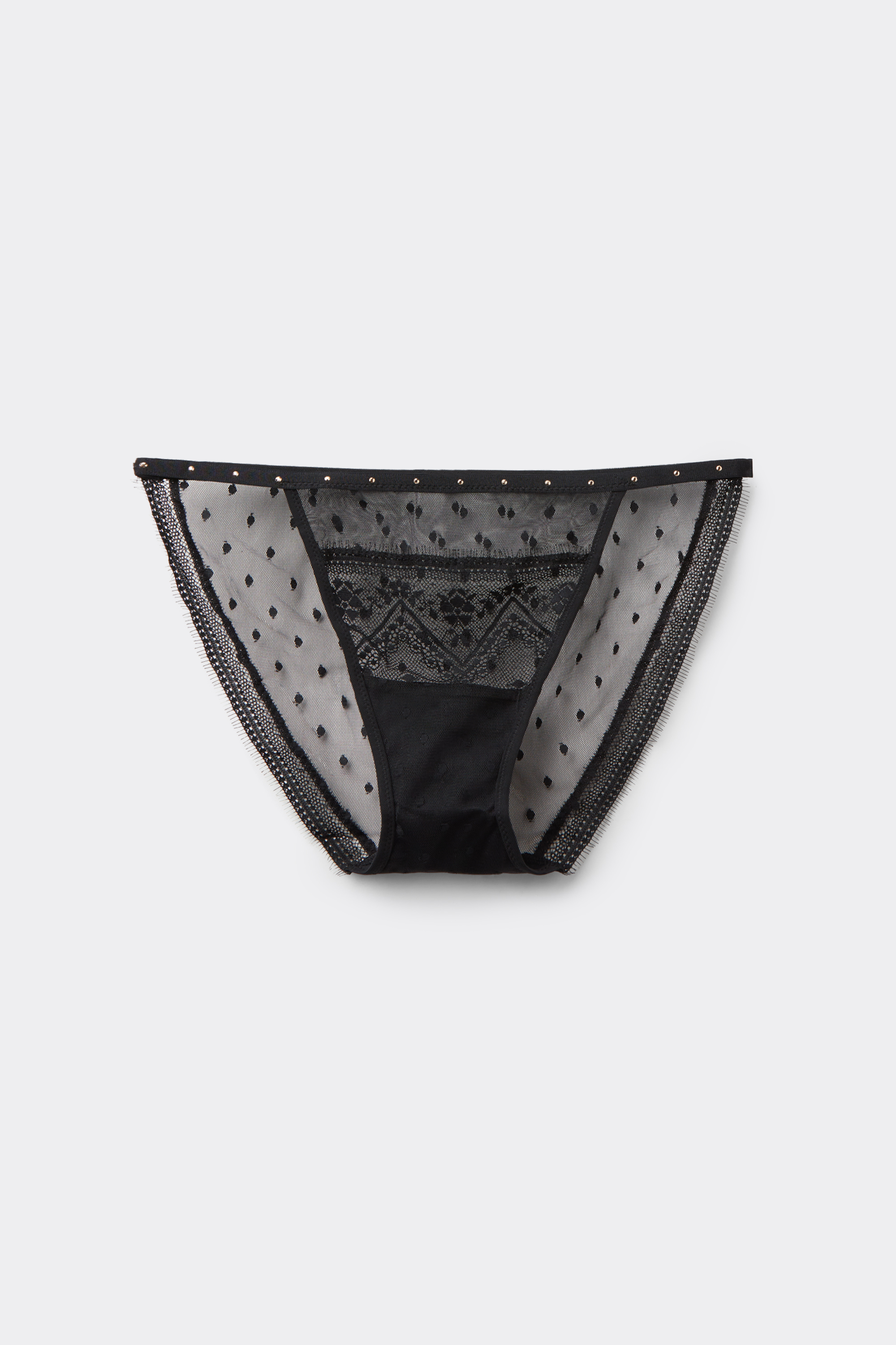 Слипы из тюля с точечной вышивкой. Вставка и кайма из ресничного кружева. Пояс из мягкой резинки с золотистыми заклепками.