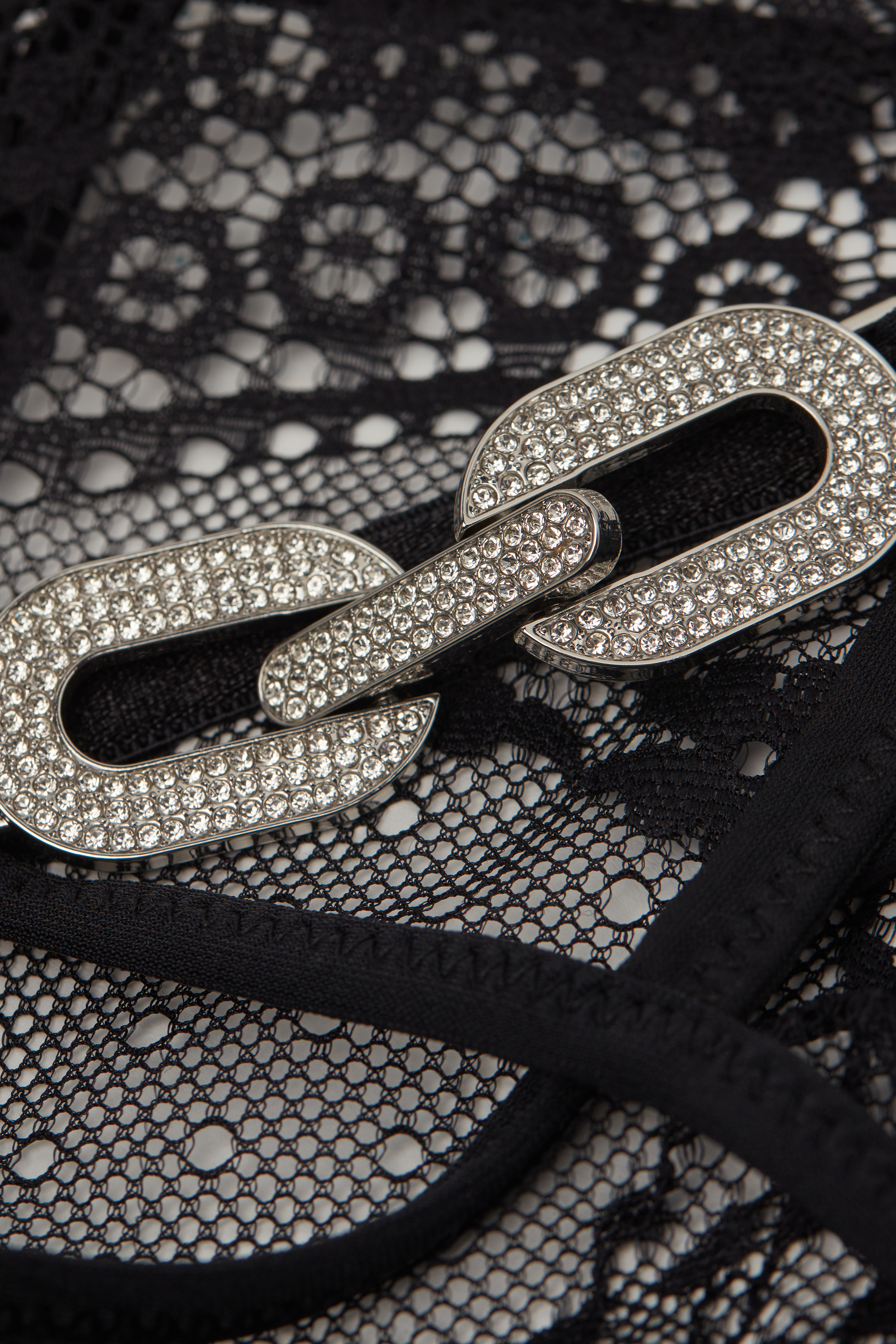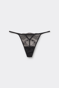Чувственные кружевные стринги с отделкой из микрофибры. Сзади изящная цепочка со стразами.