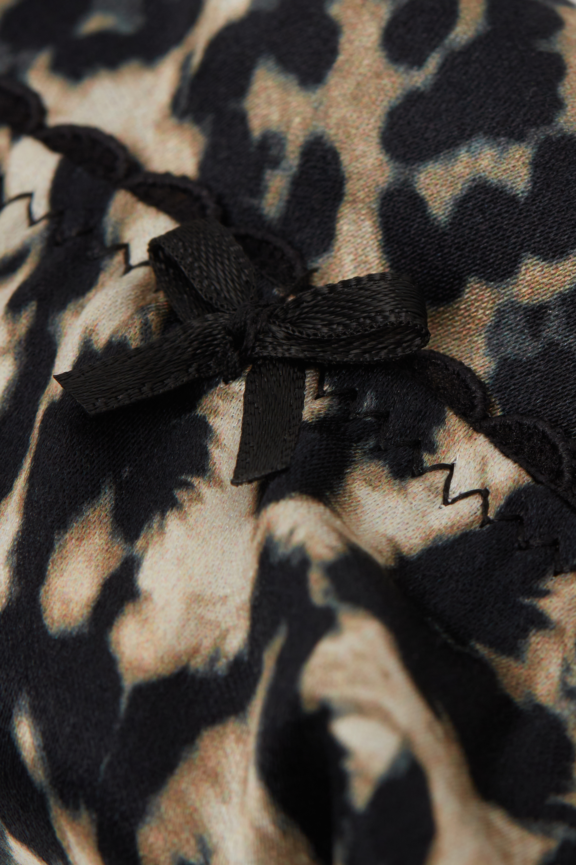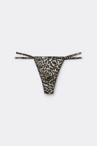 Стринги из слегка эластичного шелкового атласа с анималистичным принтом. Деталь в виде бантика по центру на поясе.