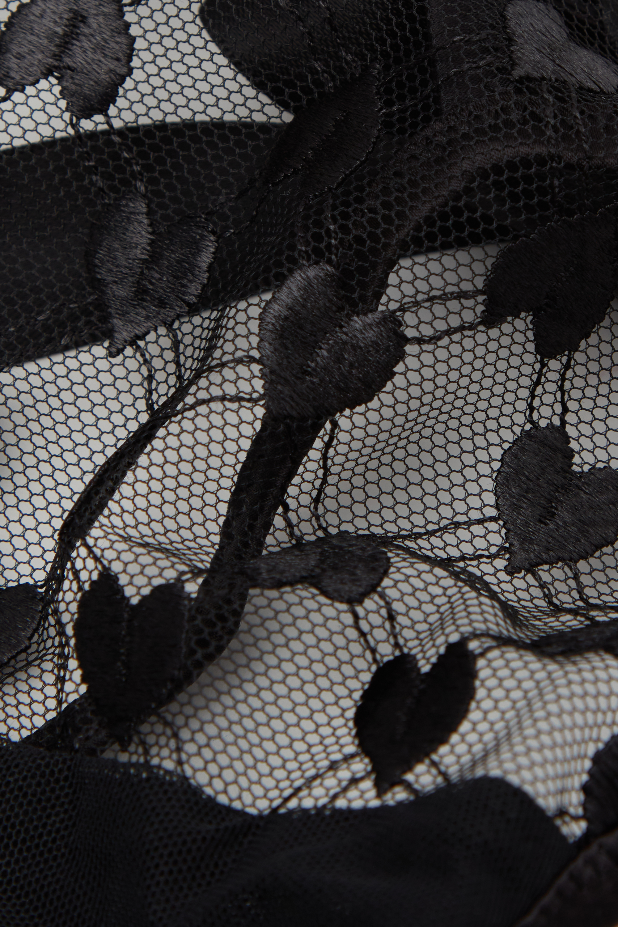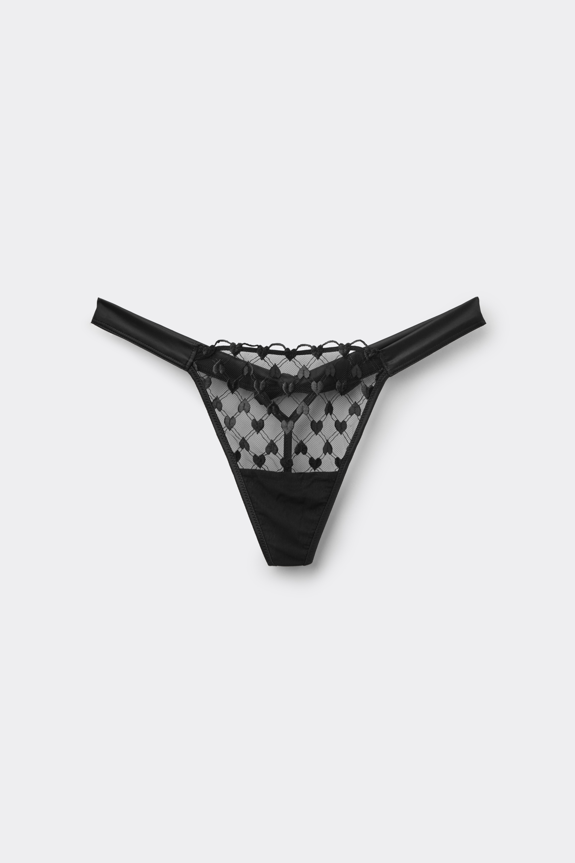 Стринги из тюля с романтичной вышивкой в сердечко и изящной атласной отделкой. Съемную ленту из атласа можно использовать как кокетливый чокер или аксессуар для волос.