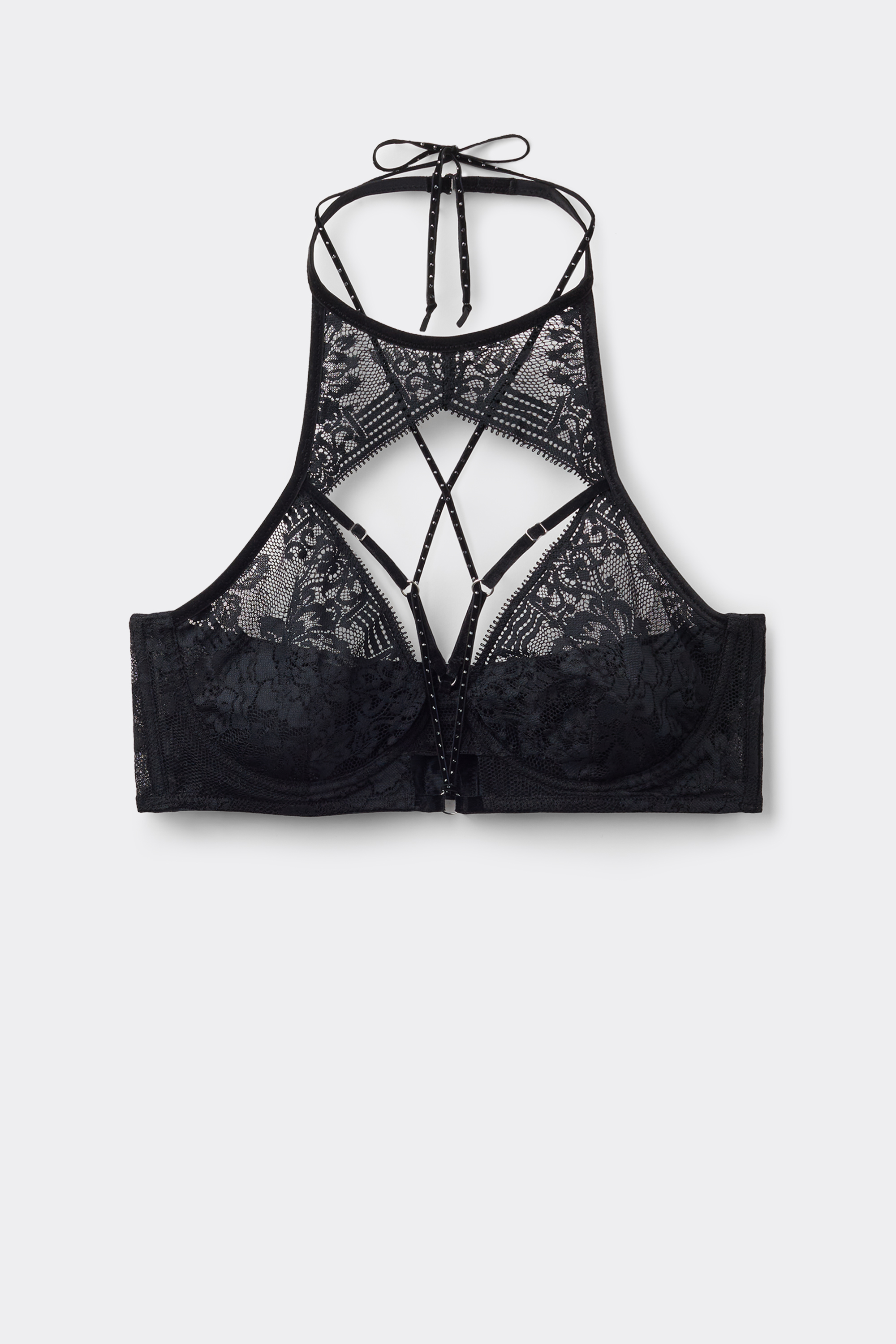 Топ-бралетт из мягкого эластичного кружева. В области декольте соблазнительное переплетение эластичных тесемок с бархатистой фактурой. Съемный аксессуар в виде эластичного бархатного шнура, украшенного стразами в тон, можно завязывать за шеей, придавая образу еще большую чувственность. Изделие можно носить в качестве видимого слоя одежды под рубашкой или жакетом.