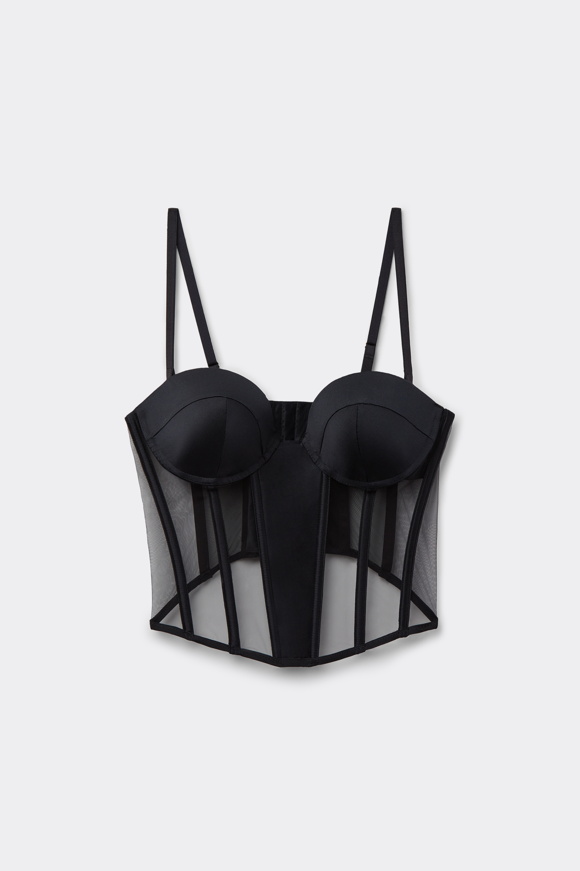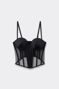 Топ-корсет в форме бюстье — безупречное сочетание элегантности шелка с чувственностью тюля. Модель можно носить как отдельно, так и с жакетом.