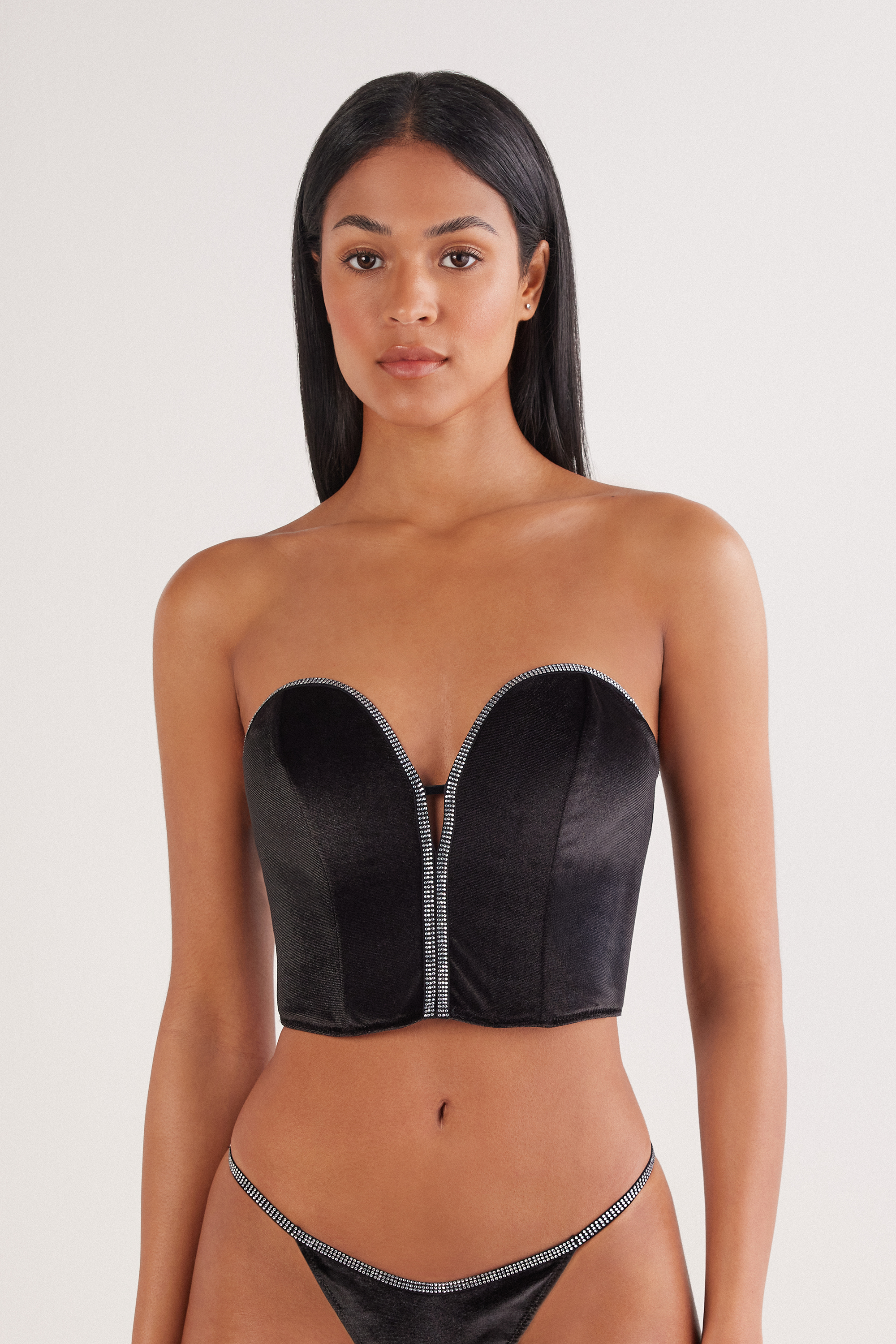 Элегантный топ-корсет из мягкого бархата с отделкой стразами. Вертикальные косточки по бокам и по центру, а также легкое и мягкое уплотнение в передней части помогают изделию держать форму. Глубокий вырез в форме сердца подчеркивает зону декольте.