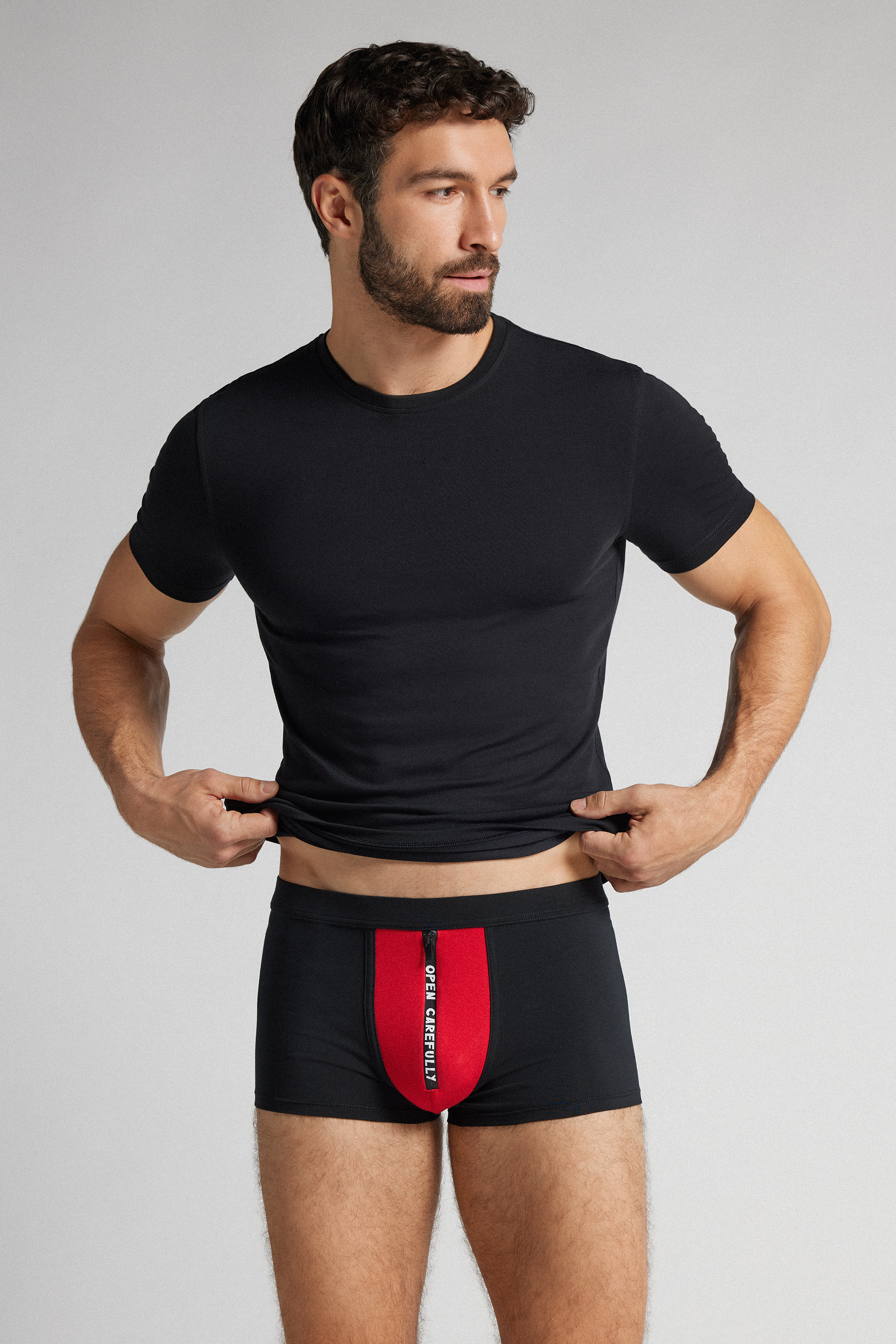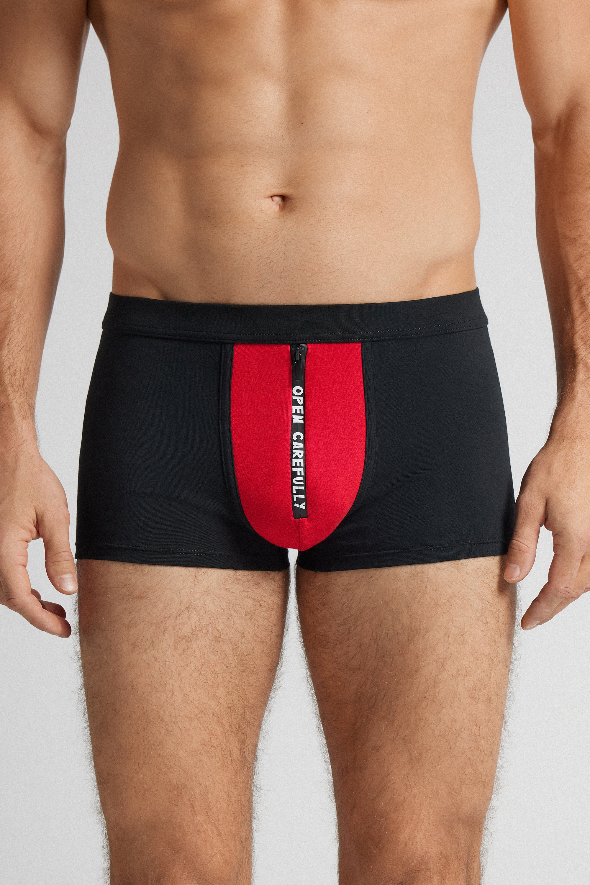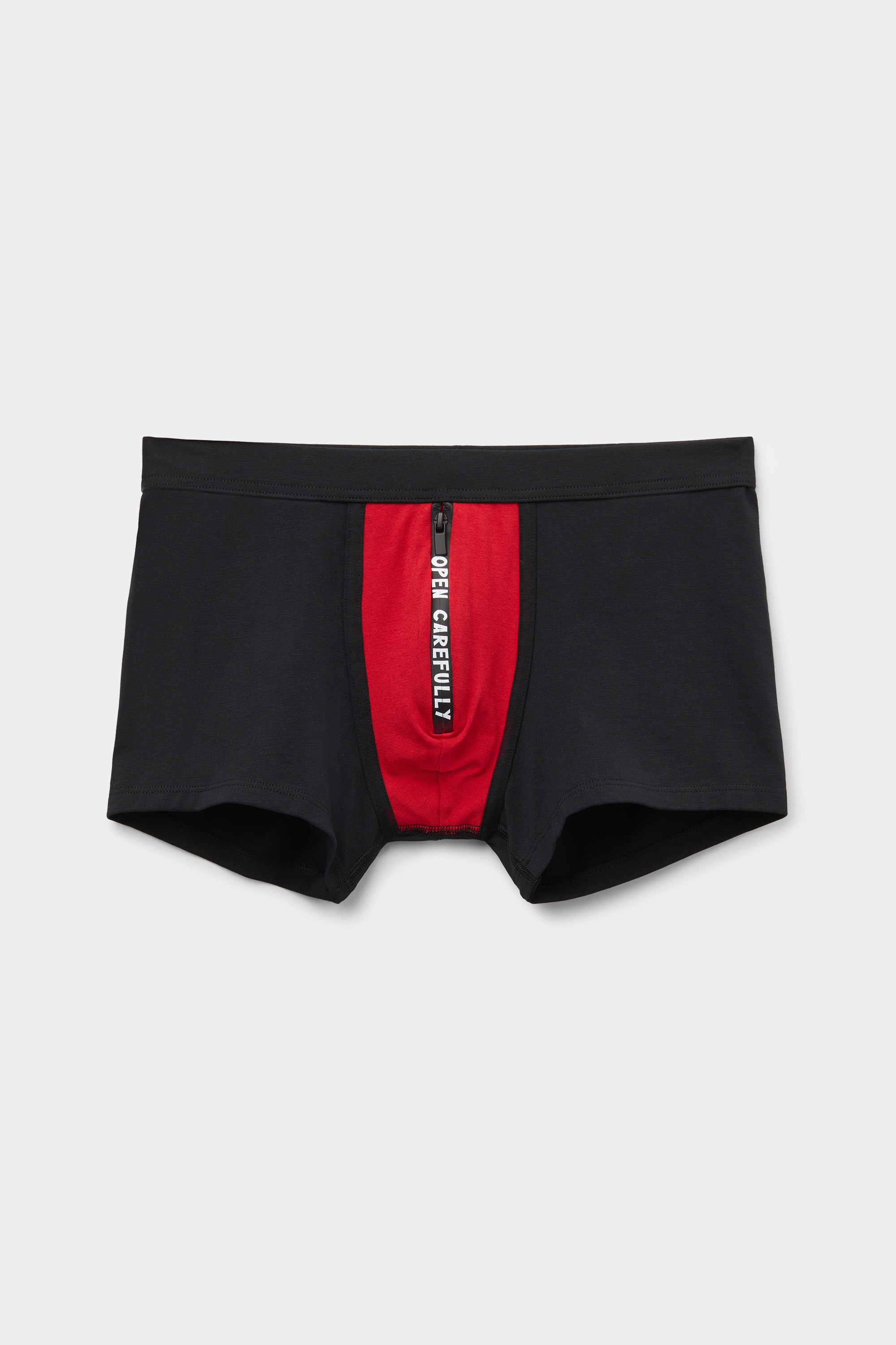 Мужские трусы боксеры из мягкого эластичного хлопка Superior. На вставке по центру застежка-молния и надпись Open Carefully. Под молнией защитная вставка из ткани.