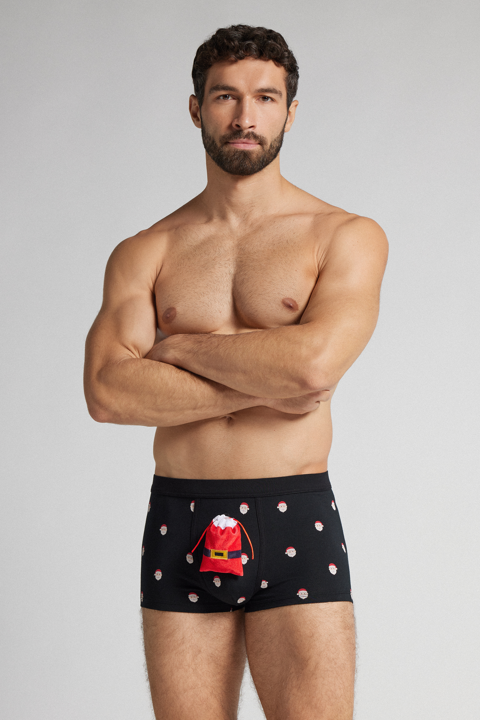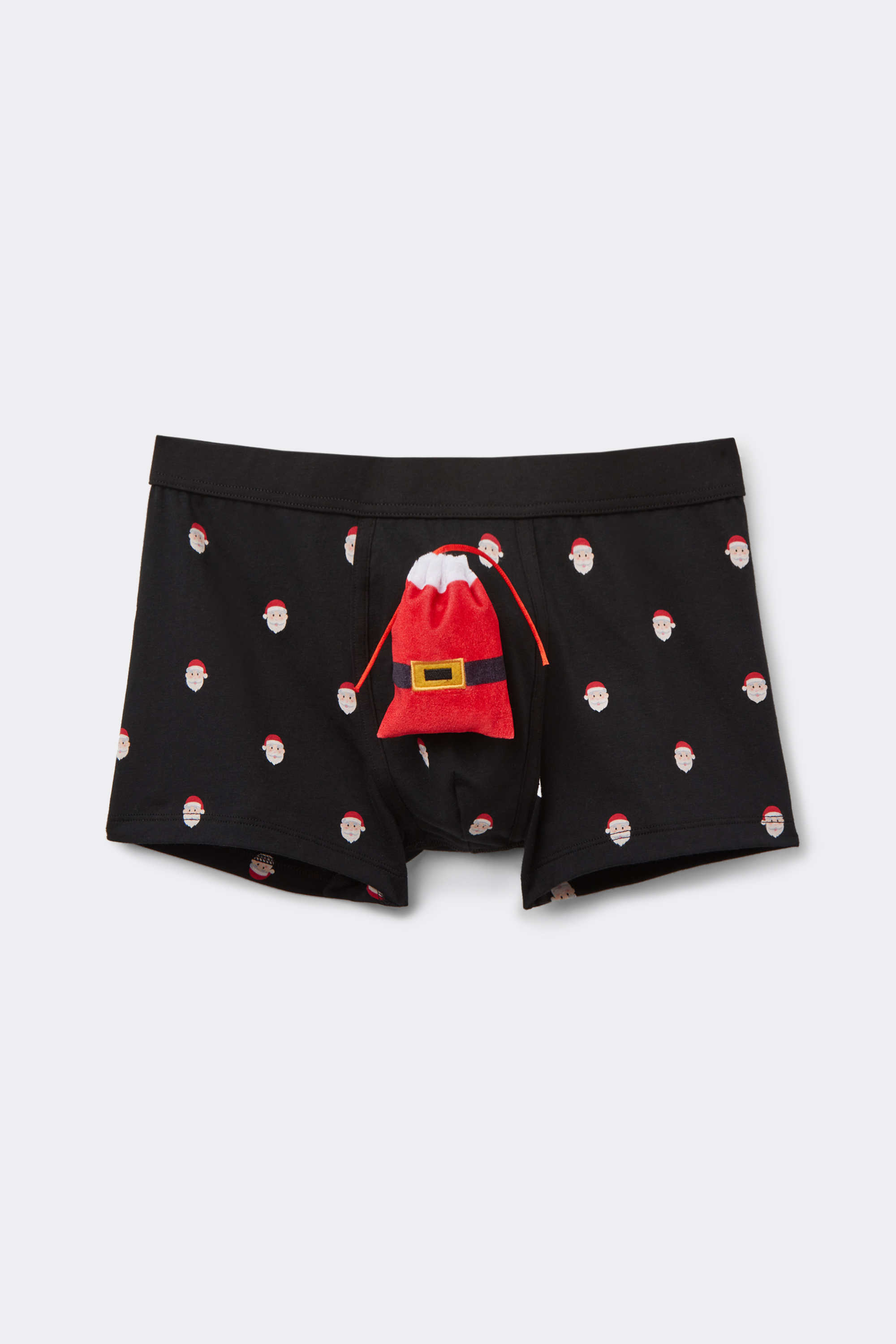 Мужские трусы боксеры из мягкого эластичного хлопка Superior с принтом Санта-Клауса по всему изделию. По центру бархатная аппликация в виде мешка с подарками. Мешок с мягким наполнителем из ваты.